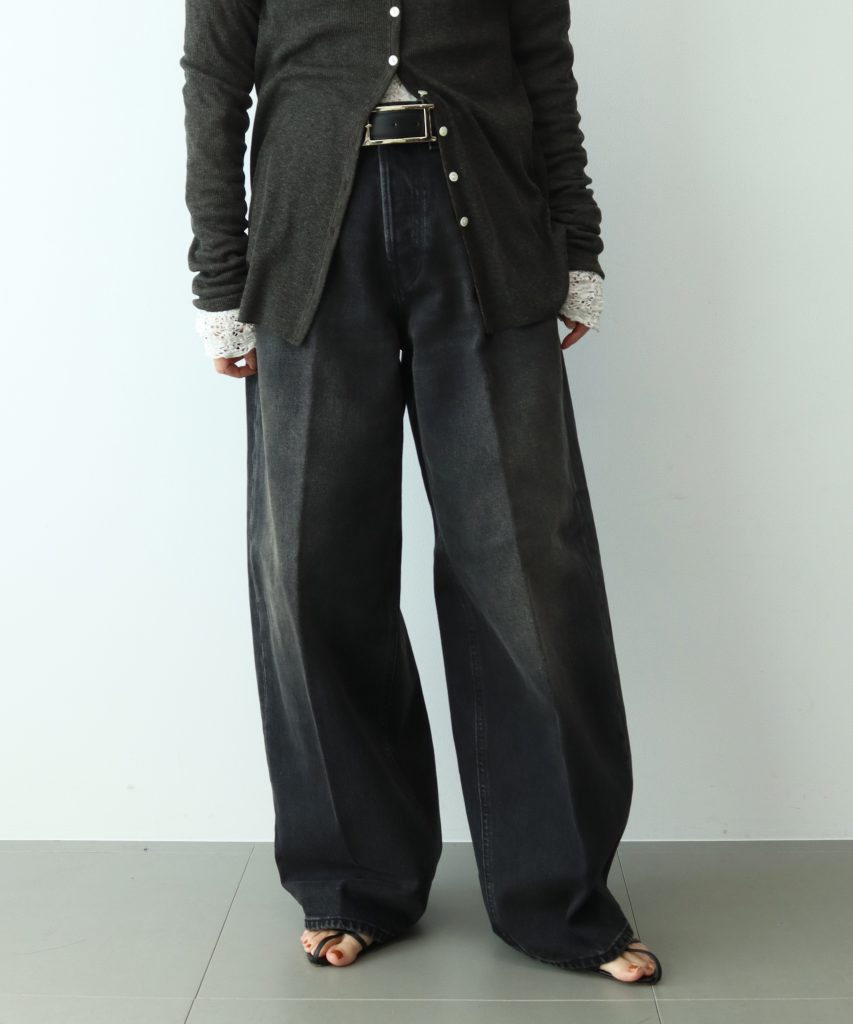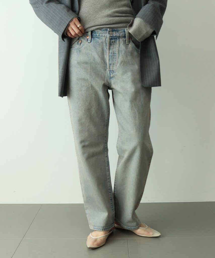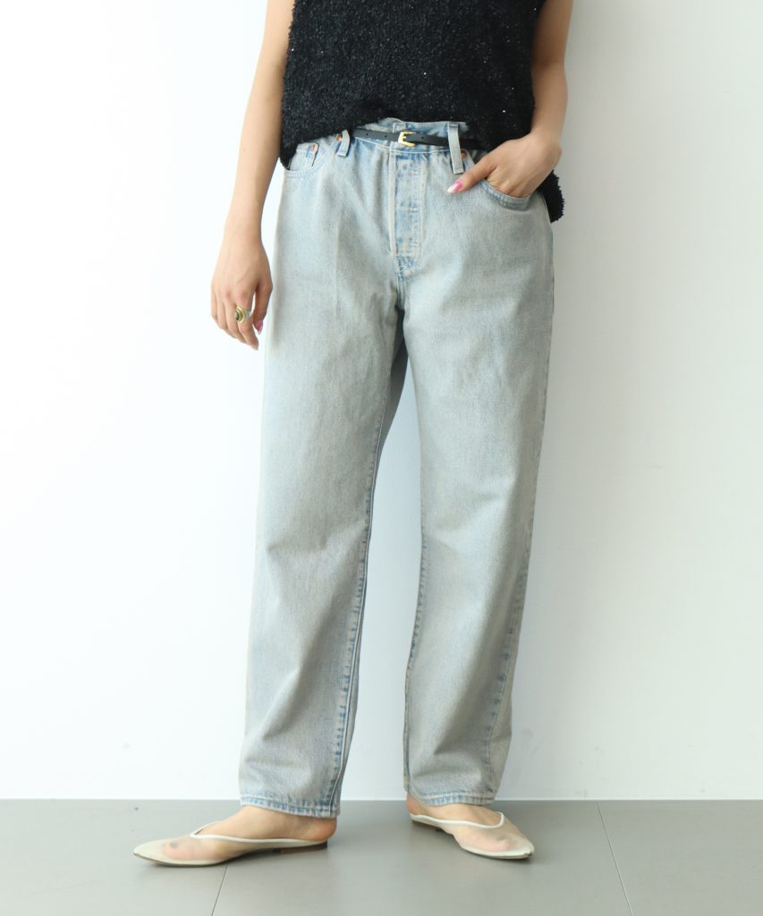 太ももからひざ下の加工が程よいヴィンテージ感で、幅広いスタイリングに合わせていただけます。