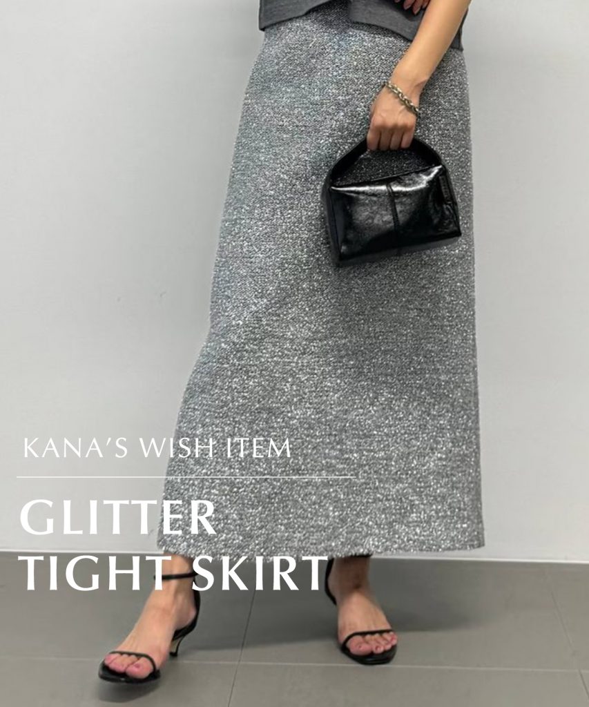 トレンドのキラキラしたシルバーがキャッチーなタイトスカート。