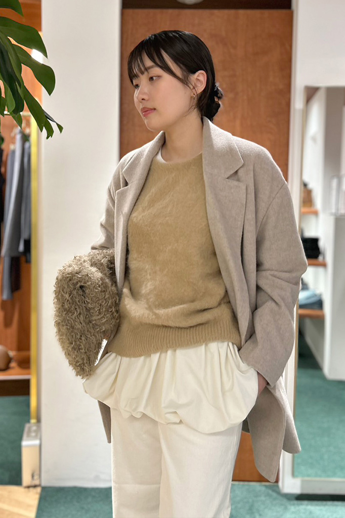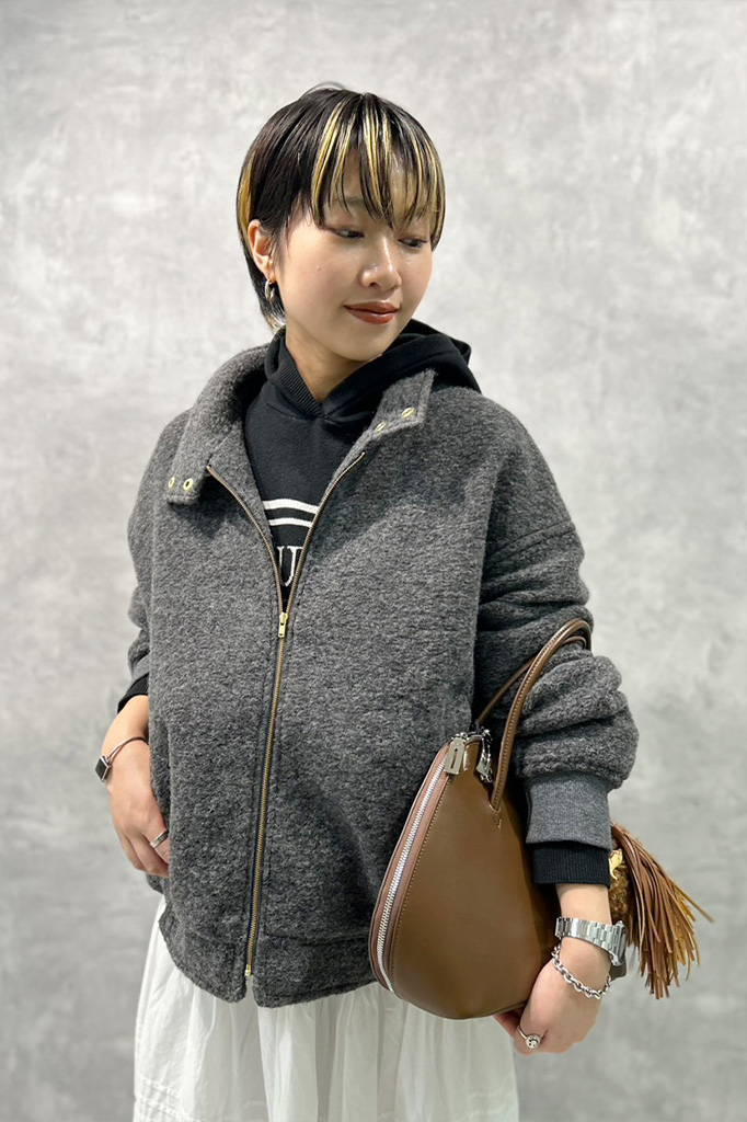 毎年人気のAQUAニットに裾バルーンプルオーバーをレイヤードして今年らしいスパイスをプラス。ファーBAGでシーズンムードもUP。