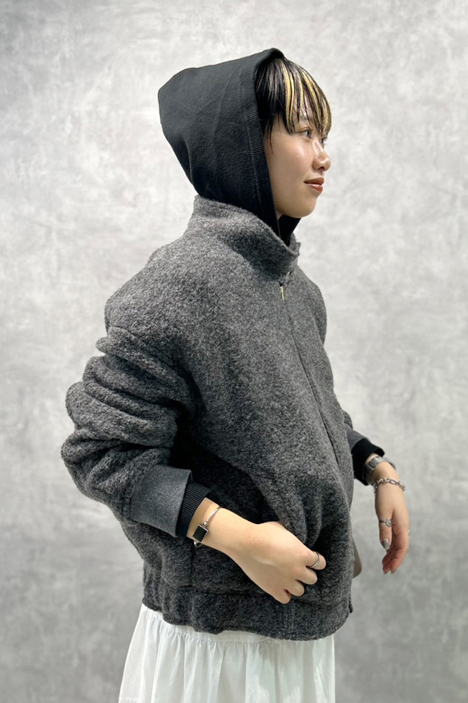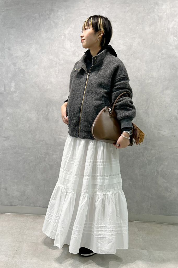 カジュアルになりがちなこちらのアウターはフード付きニットとレーススカートでフェミニン×スポーティな着こなしに。リブの袖口で冷たい風も入らず安心。
