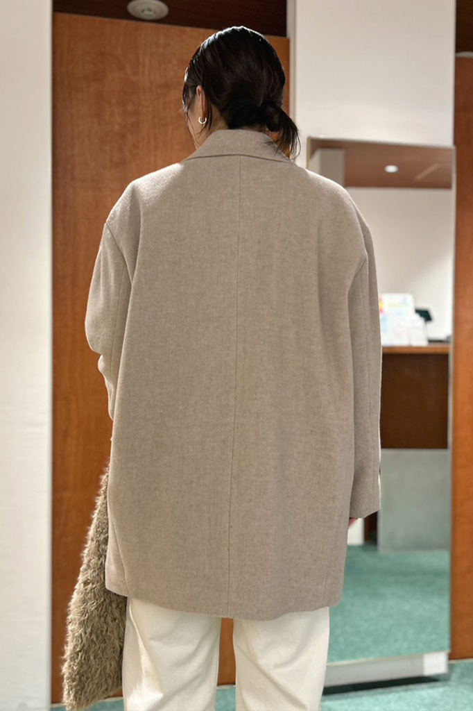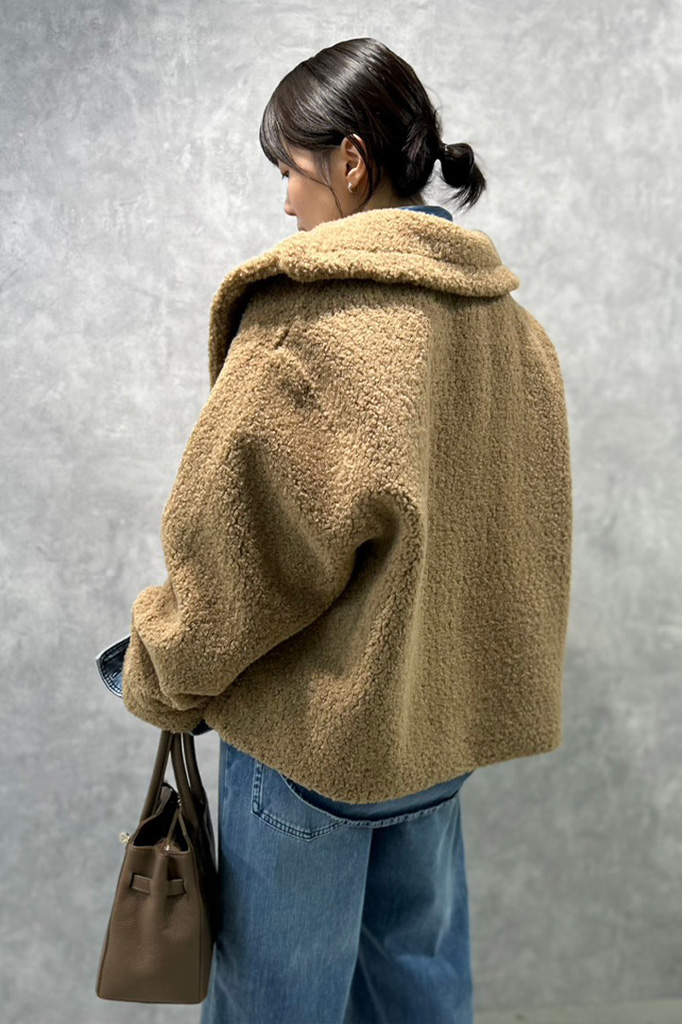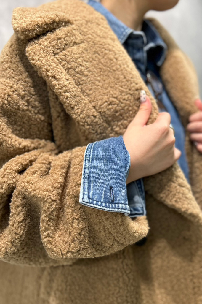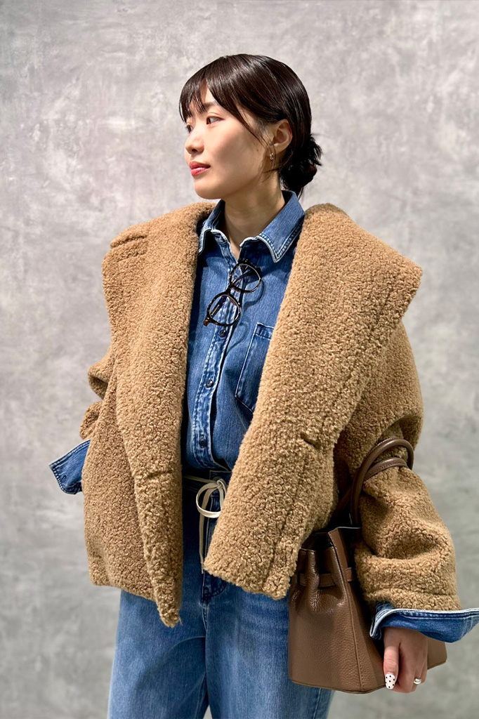 デニムコーデにさっと羽織った上級者コーデ。もこもこの生地でしっかり暖かさもあり、ゆったりめのサイズ感なので中に厚手のニットも着ていただけます。