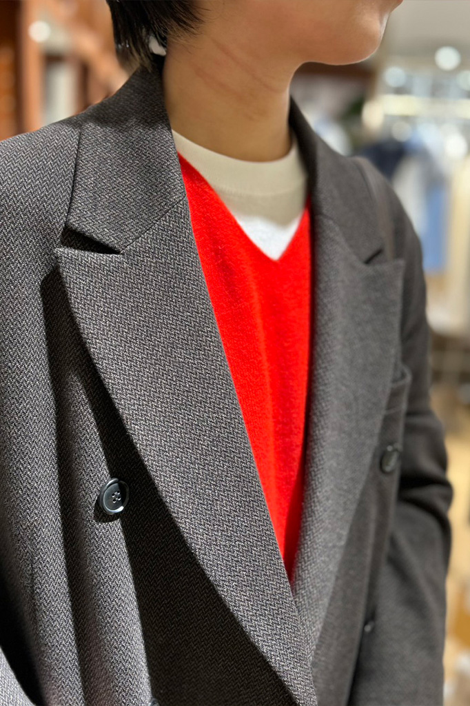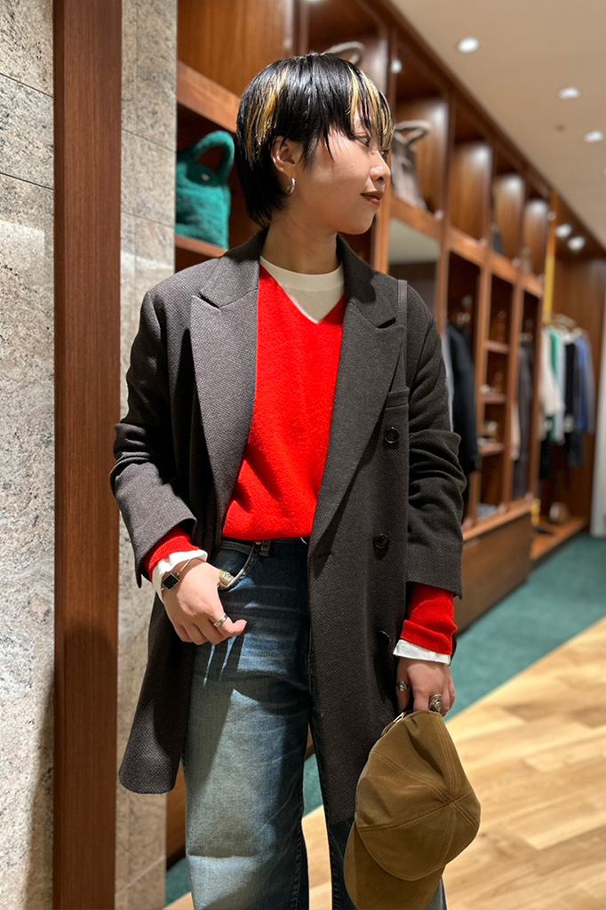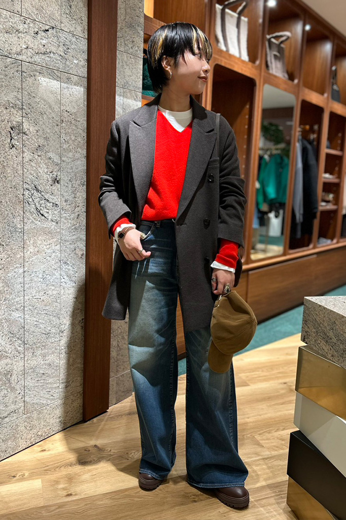 印象の深いブラウンなので、ロンT×赤ニットで一気に華やかに仕上げました。デニムで着崩してこなれ感たっぷりなスタイリングに。