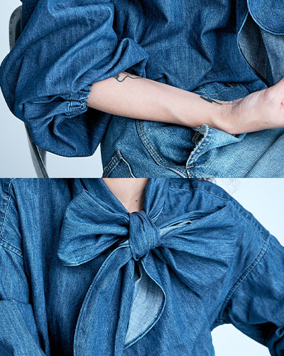 ラフさは程良く抑えて、製品染めをしたカラーデニム。腰回りはすっきりさせ程よいワイドシルエットに仕上げてます。ハイウェストでも少し腰を落としても履けるので、合わせるトップスやすタイリングで履き方を変えるのがいいですね。シンプルなコンパクトトップスはもちろん、ボリュームトップスでもすっきりとバランスがとりやすく幅広いスタイリングが楽しめます。