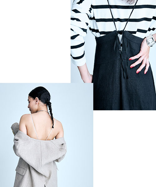 ノーカラージャケットと同素材で仕上げたコンビネゾン。今時期は薄手のニットの合わせや、シャツやジャケットを羽織ったスタイリングがオススメ!夏は潔く1枚で!!といきたいとこですが、タンクやキャミを合わせたスタイリングが着やすいですね。同素材のジャケットをわせれば、チュラルなリラックス感ときちんと感をバランスよく取り入れたれカジュアルすぎず上品な印象のスタイルが完成します!