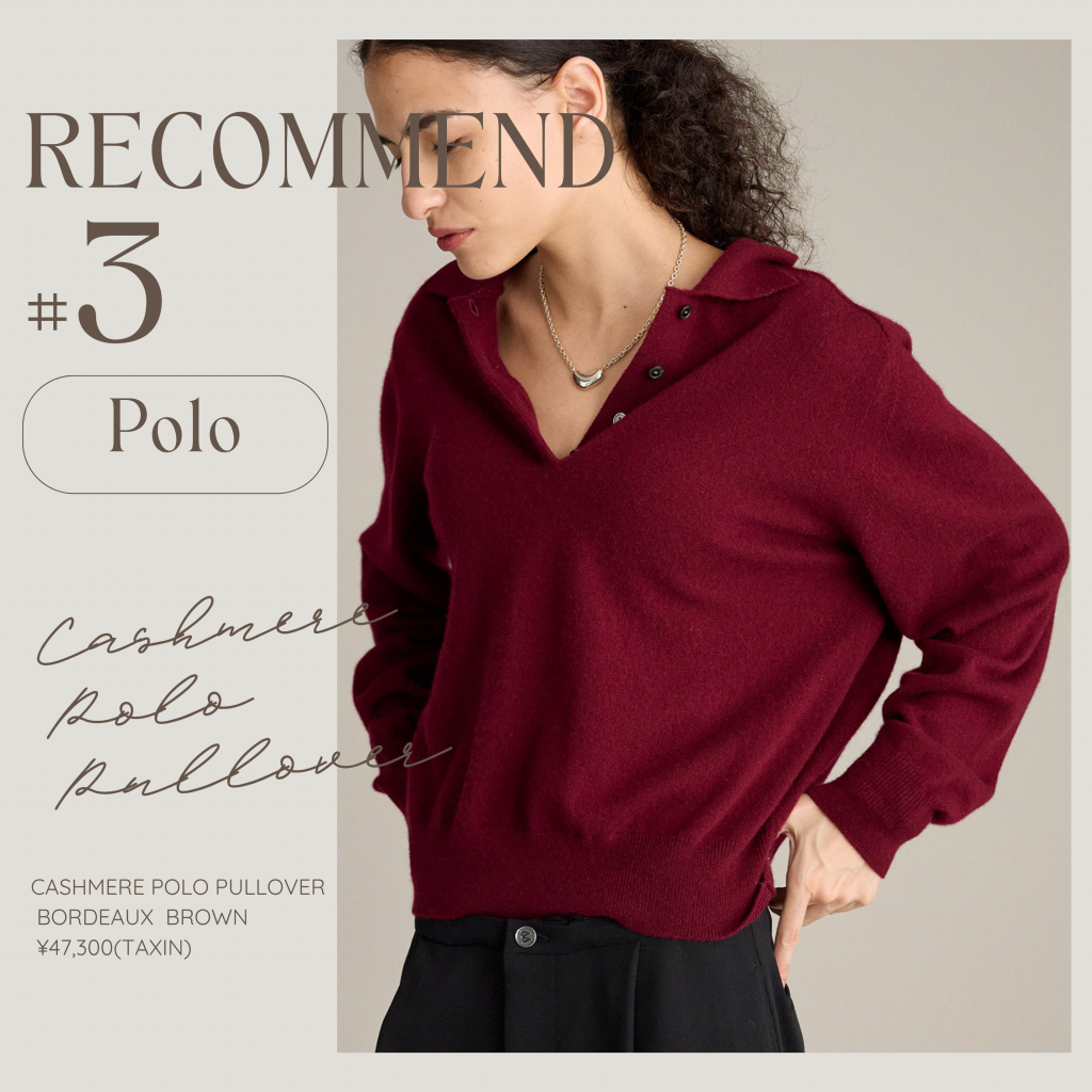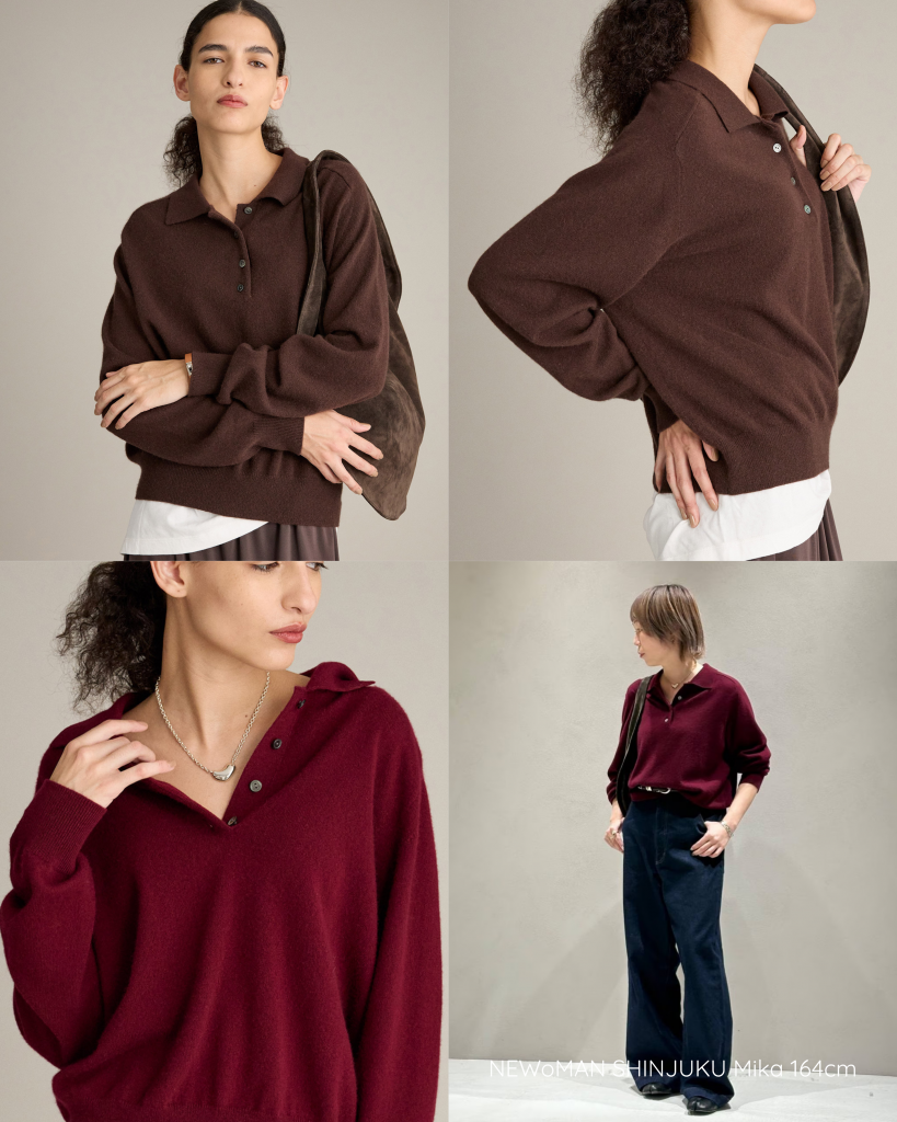 トレンドのポロニットに今季注目カラーのボルドーとブラウンをのせた最旬アイテム。品の良さと知的なムードが醸す襟付きデザインは、着るだけでスタイルが完成。素肌に着用するだけ。難しいテクなし!着るだけでサマになるのが魅力。ややゆったりとしたサイズ感とエポーレット袖が、ベーシックになり過ぎず程よいモード感をプラス。そしてBRILLを語る上で外せない素材。高品質なモンゴル産カシミヤを使用。安定した染色と極上の柔らかさ、そして軽やかな温もりを兼ね備え、カジュアルにもきれいめにも馴染む万能さで、新しい定番として、クローゼットに迎えたい1枚。