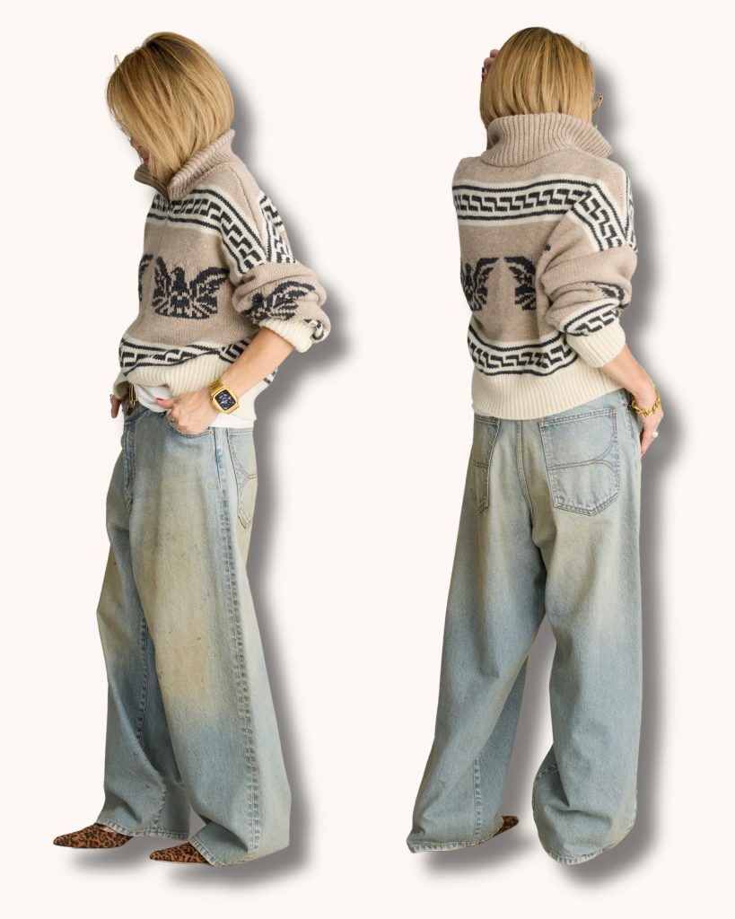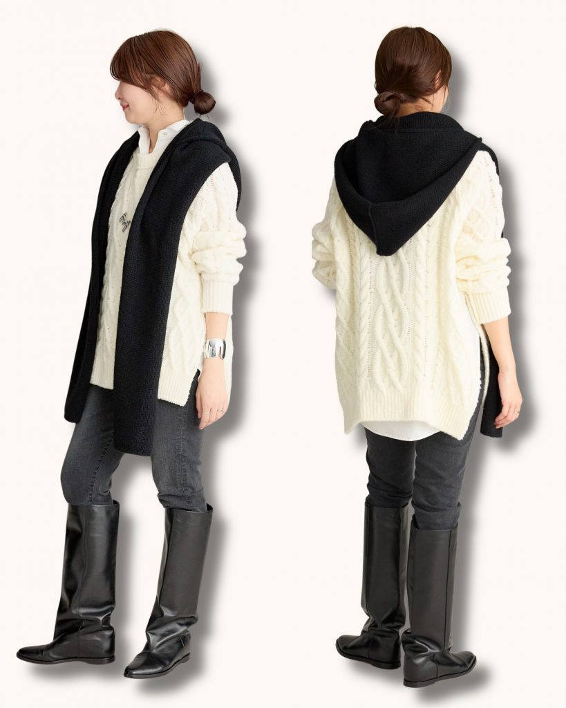 ③スタイリングの理由:食べて歩いて買い物して…を満喫する気合いの日なので、とにかく暖かく、動きやすく、でも少しきれいめに見えるようにまとめました。ざっくりニットに細身のデニムとロングブーツでバランスよく。カシミミストールは、ぐるぐる巻きにしたりさっと羽織れるよう、肩にかけて準備万端です。