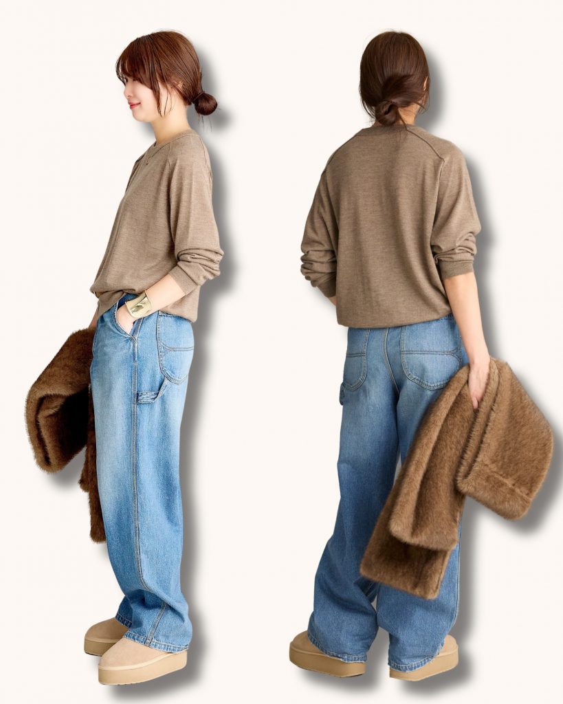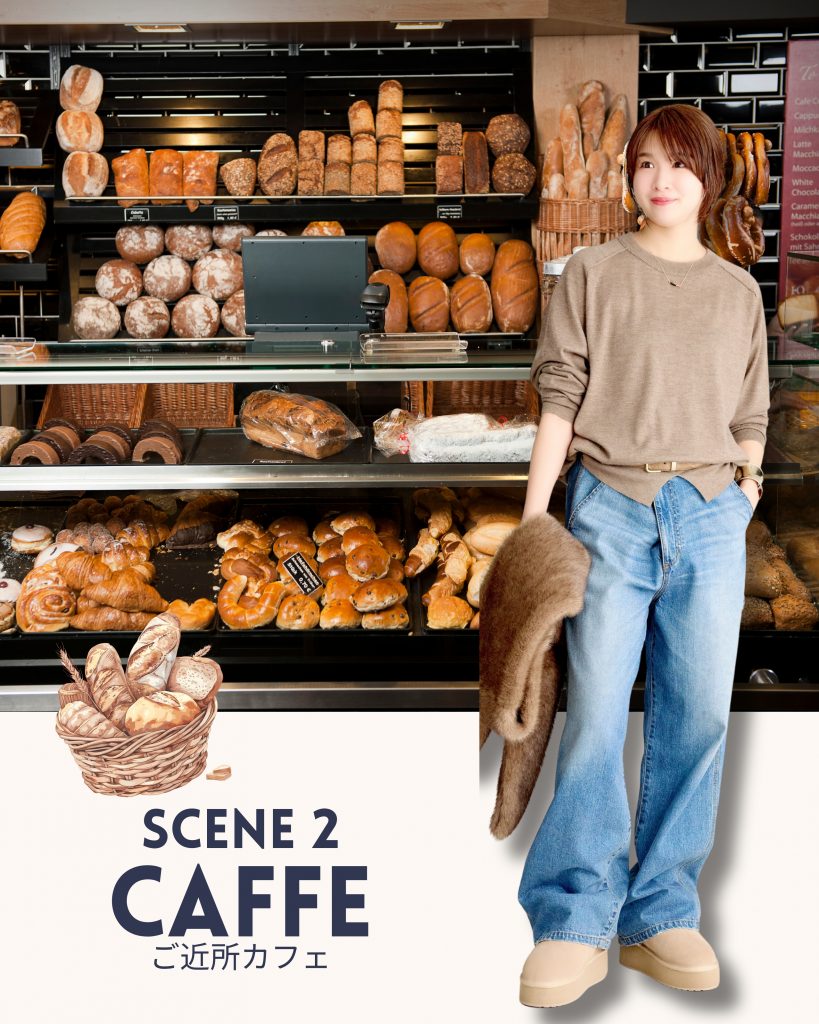 ③スタイリングの理由:近くのお気に入りのパン屋さんでテイクアウトして、公園でまったりする予定の日。さっと羽織れるように、暖かいストールを持って出かけました。トップスは柔らかい色味のニットでリラックス感を出しつつ、足元はぬくぬくで歩きやすいムートンブーツに。気負わず過ごしたい日でも、全体の色を揃えることでラフになりすぎないようにしています。