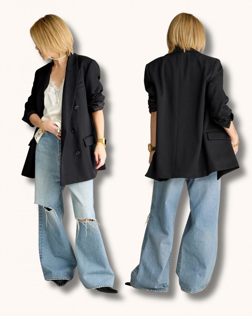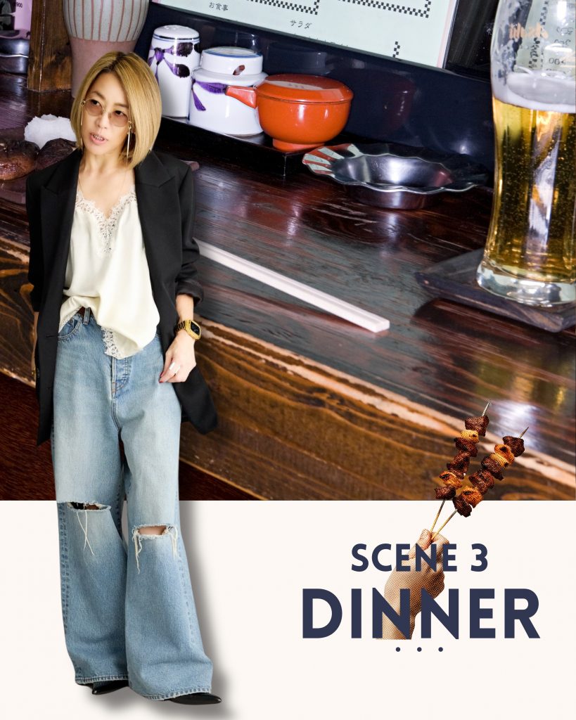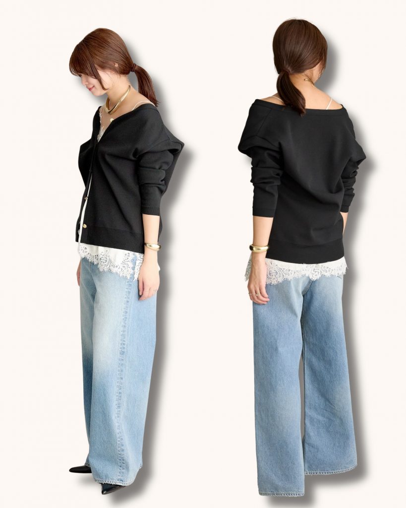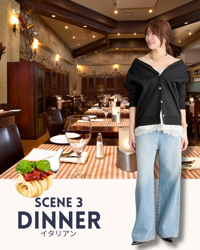 ③スタイリングの理由:今回は、クリスマス会と忘年会を兼ねたご飯会。レースキャミと金ボタンのカーディガンで、さりげなくホリデー感を出しました♡毎回しゃべって食べて飲んで…の会なので(笑)上半身はきれいめに見えるようにしつつ、下はデニムで動きやすさを重視。気負わず楽しめる、ちょうどいいバランスのスタイリングにしています。