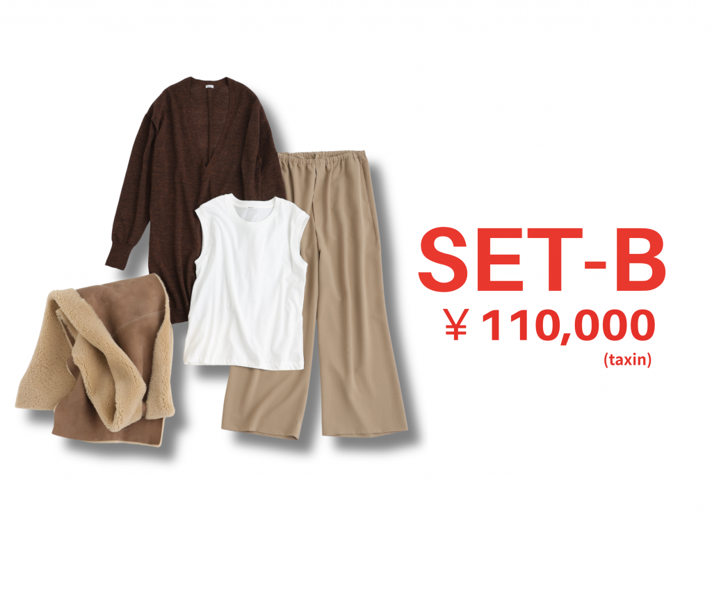 今回のセットで、一番高いセット。なんと言っても高額ムートンストールが入った4点20万相当!これはほんとにあったかい。アウターいらずww。そしてシーズンレスで使いまわせる、ニット・カット・パンツが入ってる”ベージュなあなたへ”セット。