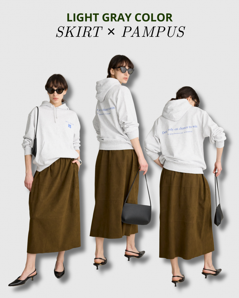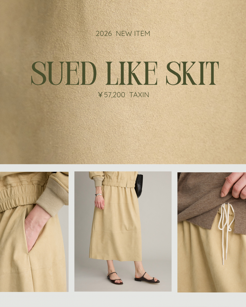 レザーほど強くなく、自然に馴染む風合いが、ワタクシ個人的にも大好きなスエード素材。このスカート日常向きのウェストゴム仕様や程よい緩さのストレスフリー。本革によくある継ぎ目も表現されてます。ほんのりフワッとしたシルエットも甘くなり過ぎない。素材とのアンバランス感が鮮度抜群!2026年、ワードローブに加えたい一枚かも。
