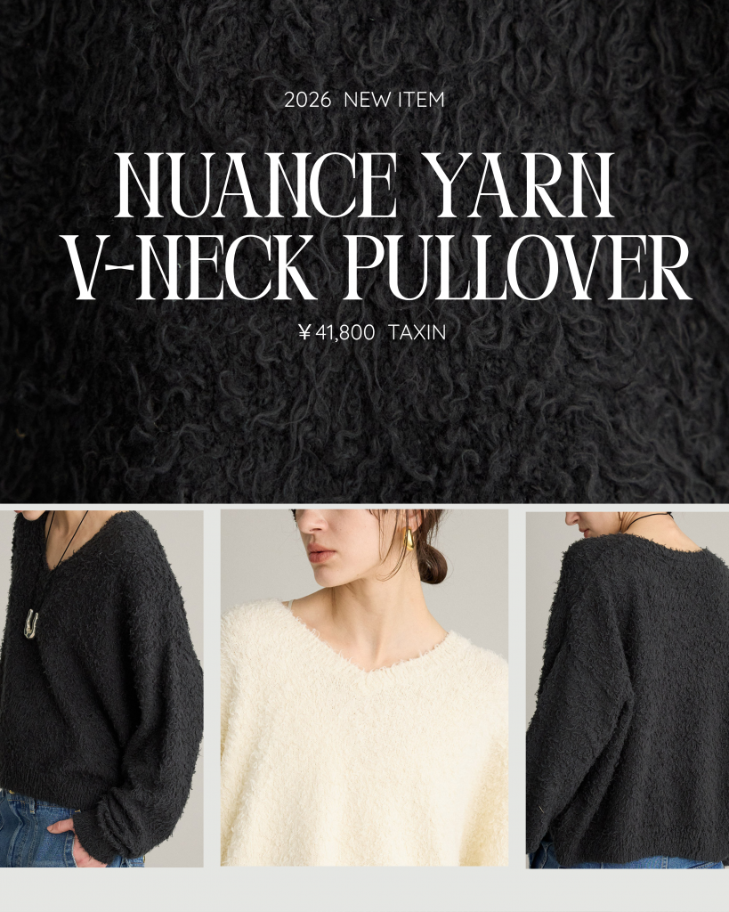 「上質」「シンプル」「快適」と言うことなしのコットンニットが登場。ワタクシ袖を通しました。毛足のある加工がなんとも表情あります。軽くて・暖かさもあり、長いシーズン使えそうなのも魅力!そして惹かれた理由はVネックの開き具合。前に後ろにどっちに寄せても素敵。快適な着心地の良さと完璧に整わないシルエットにノックアウト♡。これも買い!