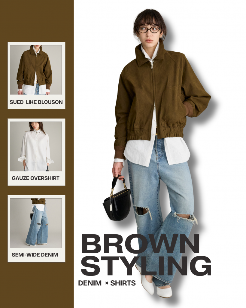 「シャツ=きちんと」のイメージをいい意味で裏切るシャツがまた登場!ブリルのシャツはどこまで進化し続けるのだろうかと、思ったアイテム。ブルゾンのインナーに合わせていたのは、ガーゼオーバーシャツ。一見ベーシックですが、いわゆるコットンシャツの「シャキッと感」とは少し違いますが、コットン素材のガーゼならではの質感や表面感で、どこか力の抜けた雰囲気が抜群!着心地・雰囲気・素材感。立ち襟や袖口のボタンでアレンジが楽しい!