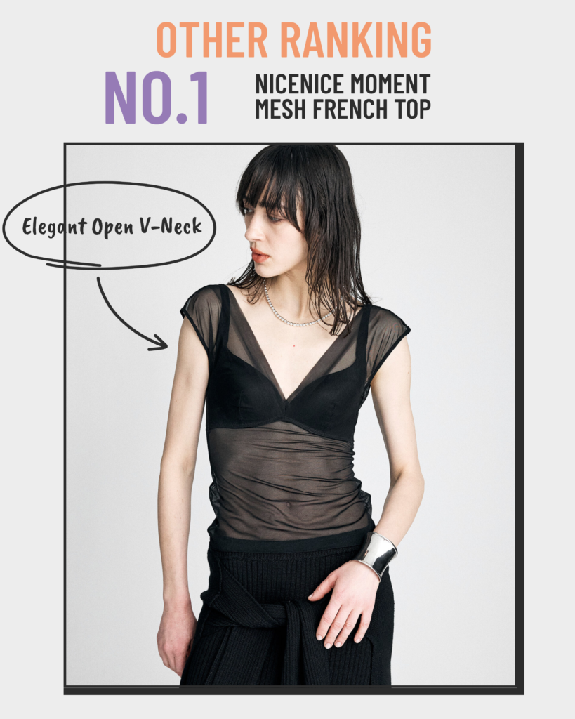 下着の枠を超えた「魅せるインナー」ナイスナイスモーメント。エレガントなVネックにトレンド感のあるメッシュ素材を採用。ジャケットやカーディガンのインナーとして、今の気分にぴったりの抜け感を演出。ブラックは完売。ブラウンも残りわずかです。