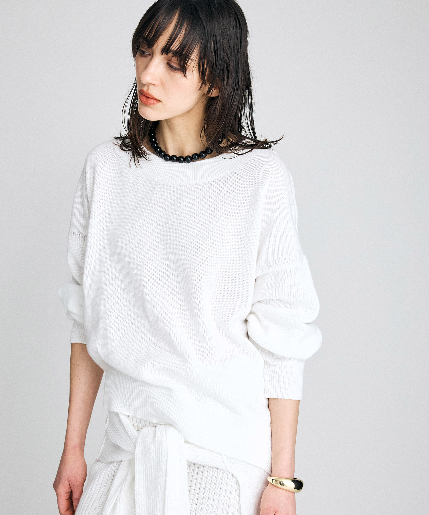 カジュアルもフェミニンも。着こなし自由な万能ニット。メンズライクな素材感と女性らしい肌見せデザインのバランスが魅力の人気ニット。