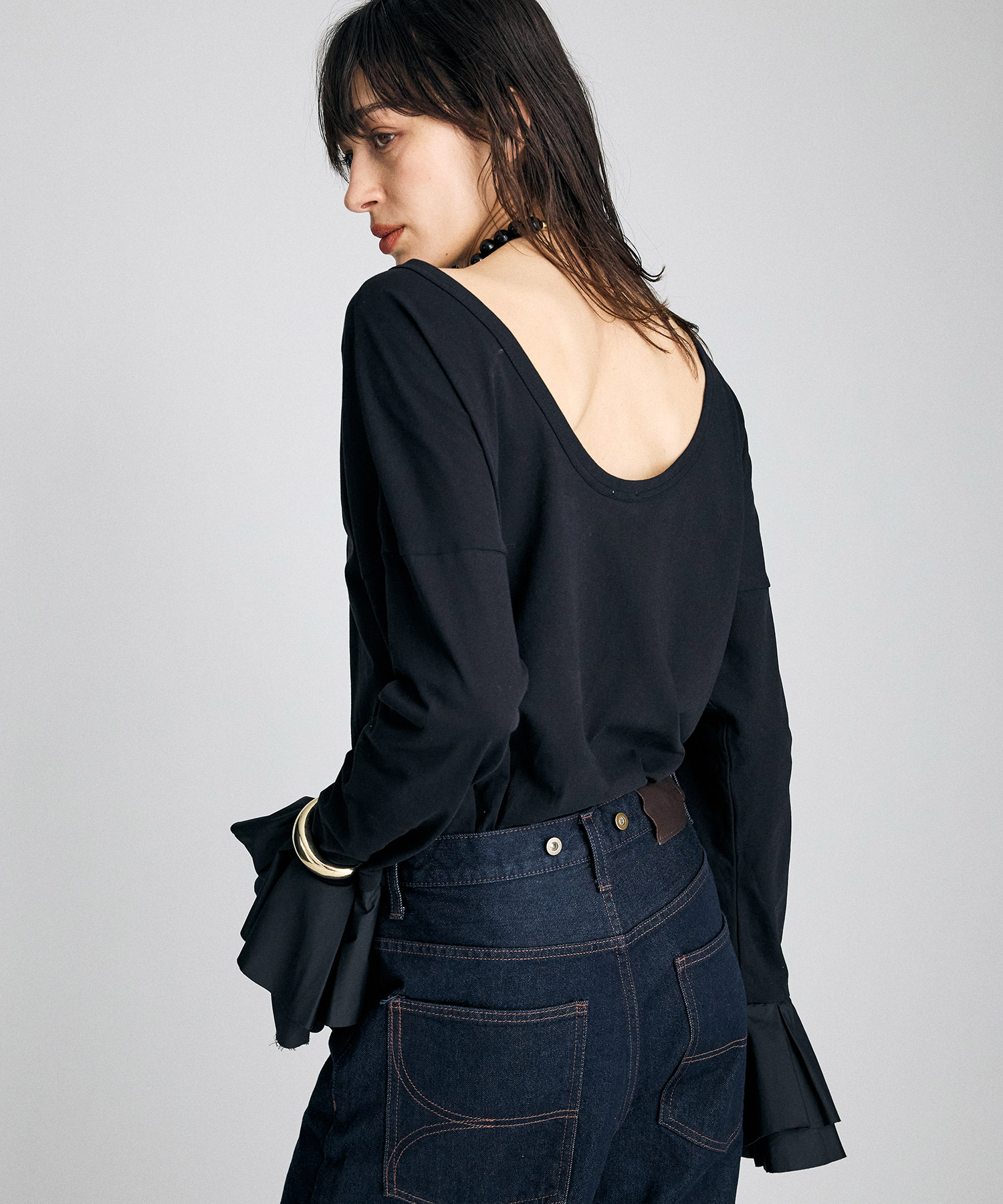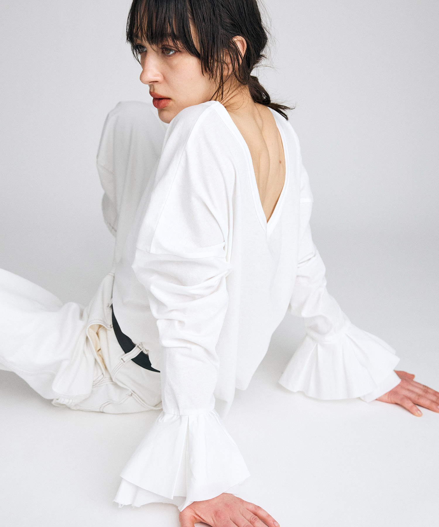 「後ろ姿も抜かりなく」上品光沢コットンのポエットスリーブ。「上質コットン × 異素材袖」洗練された大人の甘さ。今春も人気上昇!