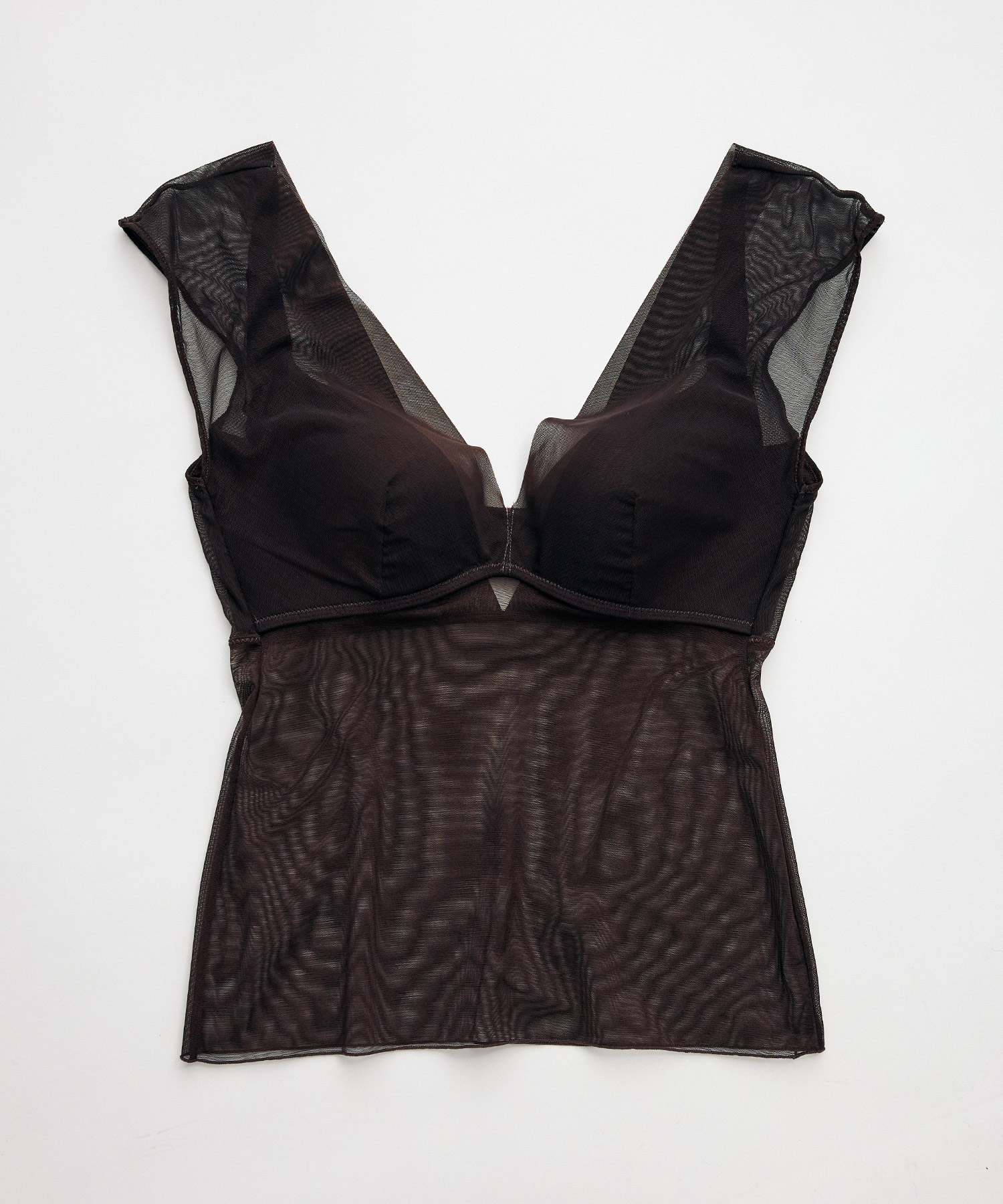 下着の枠を超えた「魅せるインナー」ナイスナイスモーメント。エレガントなVネックにトレンド感のあるメッシュ素材を採用。ジャケットやカーディガンのインナーとして、今の気分にぴったりの抜け感を演出。ブラックは完売。ブラウンも残りわずかです。