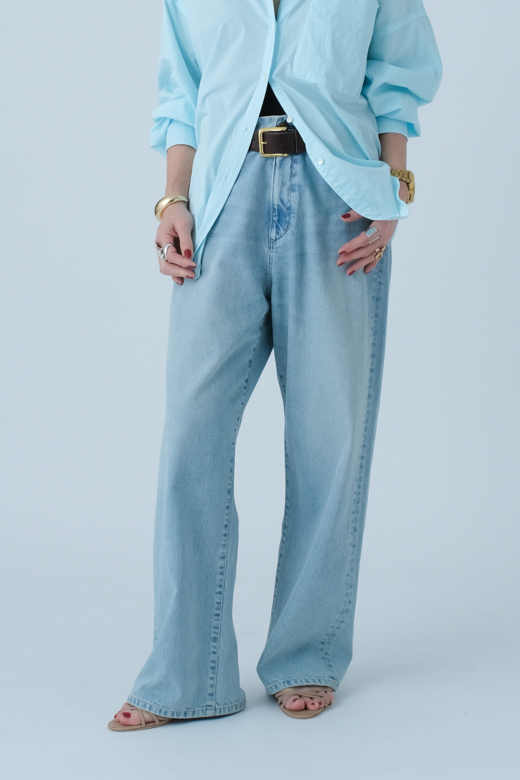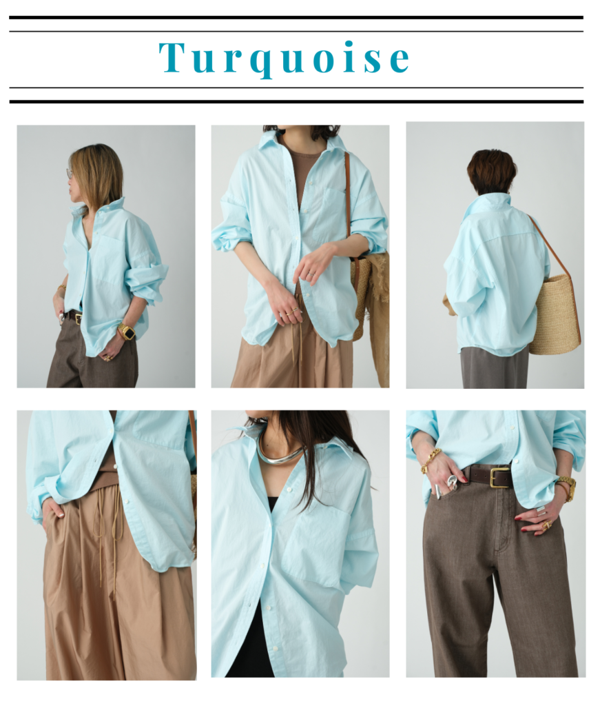 パッと明るい開放感がありながら、製品染め特有の柔らかな風合いによって、浮かずにスッと肌へ馴染みます。清涼感のある色味は顔周りをパッと明るくトーンアップさせ、一枚で着る春夏の強い日差しにはもちろん、秋冬のレイヤードの差し色としても映える絶妙な発色に仕上がっています。