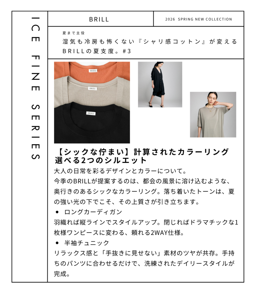 「カーディガン」は、エアコンの冷えを上品に防ぎつつ、ストンと美しい落ち感で着痩せまで叶えてくれる、夏に手放せない頼れる相棒に。そして「チュニック」は、気になるラインを優しくカバーしながら、高級糸のツヤと圧倒的なムレなさを一枚で贅沢に楽しめる、大人のための涼感トップスに。