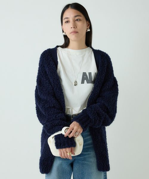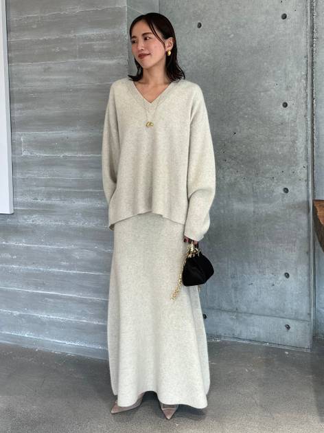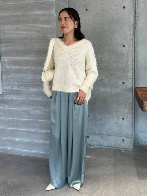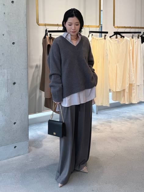 リラックスしたオーバーサイズながら、女性らしさ際立つVあきは