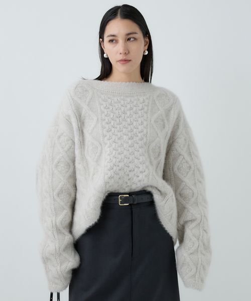 年々希少になっている”Blue fox”を染色せずに原料のまま使用したブルーフォックスシリーズが4型で登場します。カオスらしい計算されたケーブル編みのアランニット、ビブとアームウォーマーはぜひセットで着ていただきた今年らしいアイテムです。