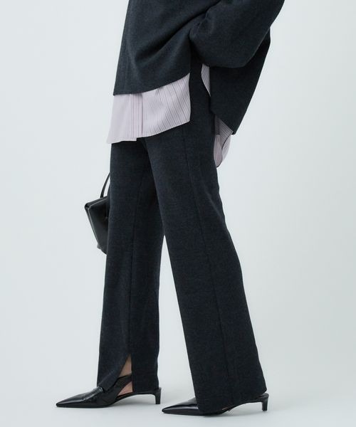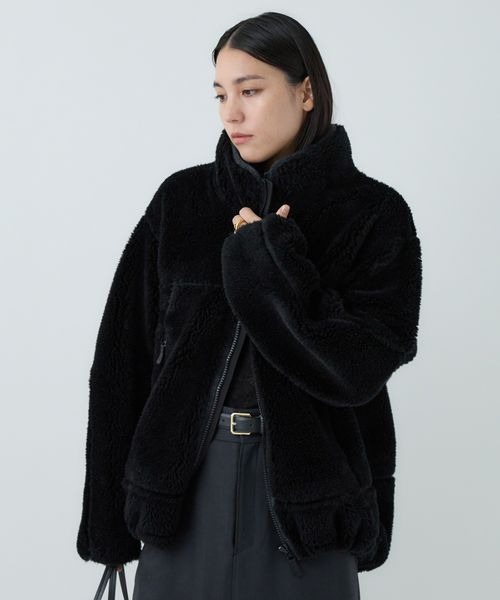 光沢のあるチャコールグレーが美しいモーラセットアップにボアブルゾンを合わせ程よくカジュアルに。