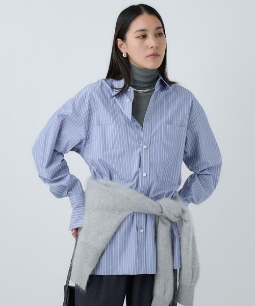 同じく定番のボーフレンドシャツより丈感を5cmほどショートにすることで、タックインしたり、丈感が短かめのトップスとの相性も◎