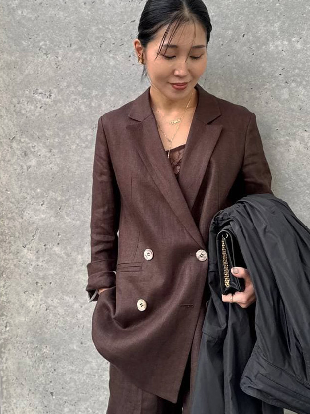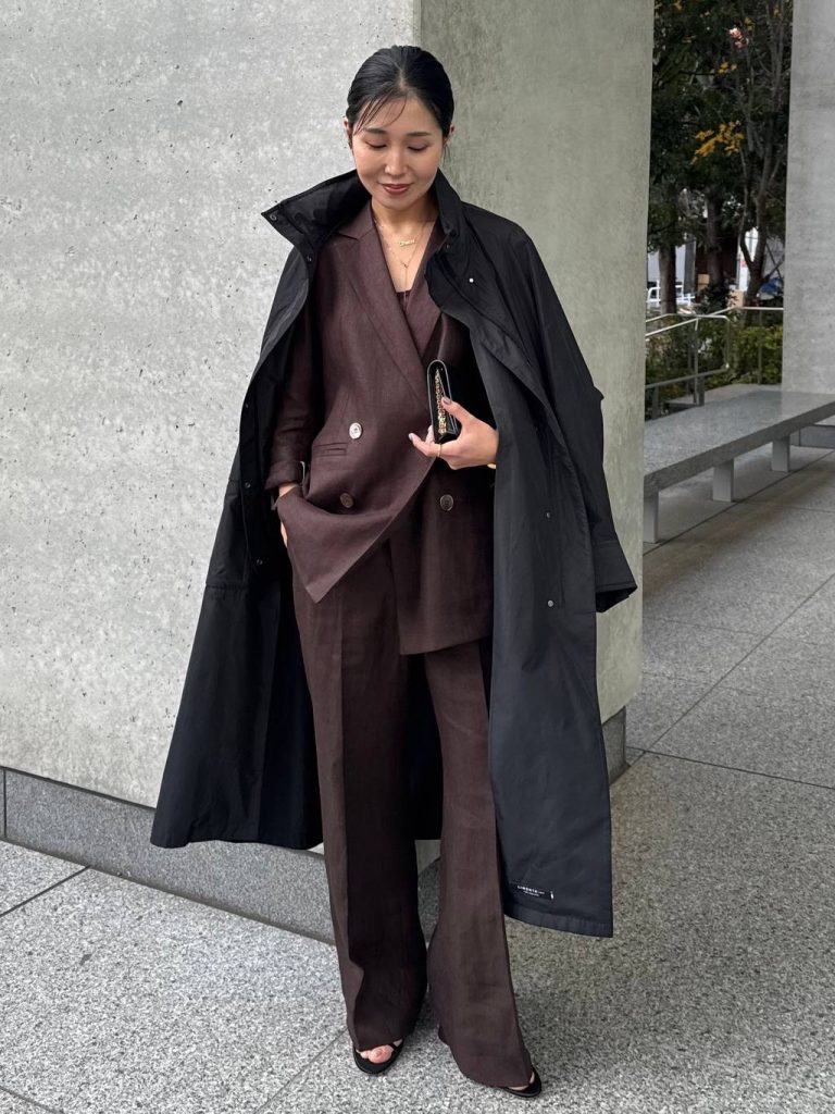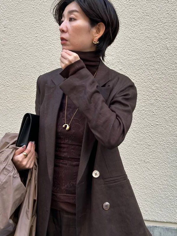 ブラックのアウターと合わせても重たくならず、むしろ洗練された奥行きを生むのがこのブラウンの魅力。潔くセットアップでハンサムに着こなし、インナーには同色のレースキャミソールを合わせて、一足早く春のブラウンを楽しんだスタイリングに♪リネンの風合いと、センシュアルなレース。この対比が、ハンサムな中にも大人の女性らしい余韻を残します。