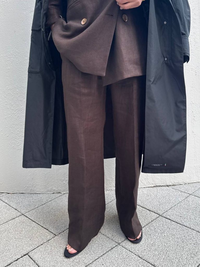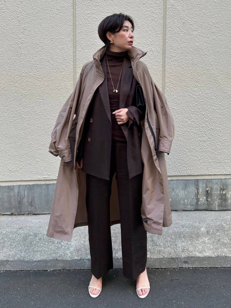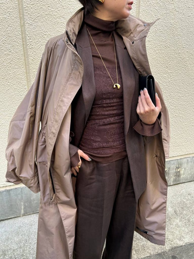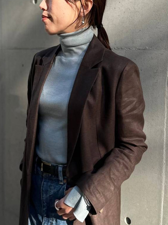リネンのセットアップと色を繋げた、究極の「ワントーンスタイル」。 同じブラウンでも、インナーに「シルクの艶」、アウターに「リネンのドライ感」という異素材を重ねることで、単調にならず、奥行きのあるハンサムな着こなしに仕上がります。 袖口に入った切り替えデザインが、ジャケットを脱いだ時や袖を捲った時に腕をすらりと長く見せ、シンプルながらも計算された美しさを演出してくれます。
