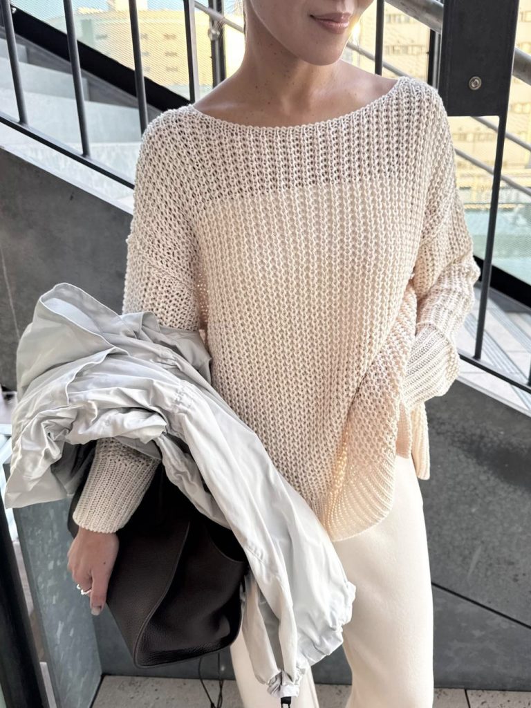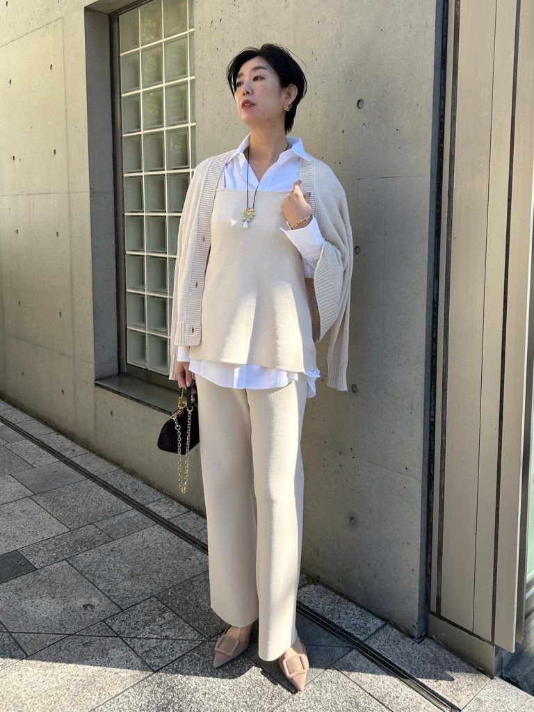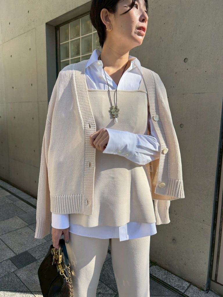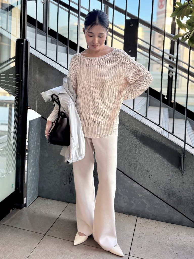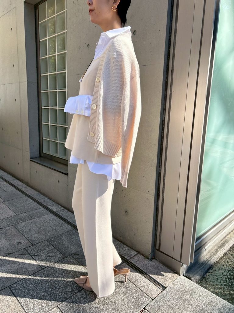 春になると着たくなる柔らかなホワイトトーンのワントーンコーデ。 「淡い色は着膨れして見えそう」と迷われる方におすすめなのが、この異素材合わせです。 ざっくりとしたニットの編地に対して、ボトムスには落ち感のあるシルクコンパンツ(こちらも名品!)を合わせて。素材のコントラストをつけることで、のっぺりせず洗練された奥行きが生まれます。 全身白でも気負わず着られるのは、すべてホームケアが可能だからこそ♪