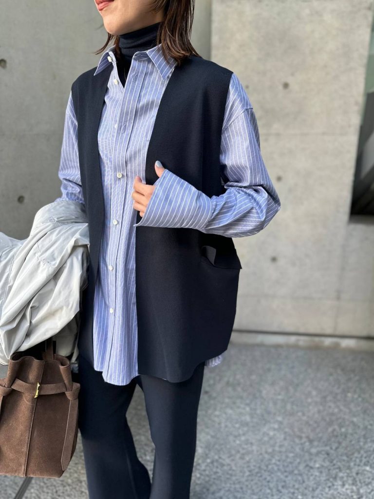 「シルクコンベスト」はボタンレスのミニマルなデザインで、同系色のシャツの上にさらりと重ねるだけで一気に旬なレイヤードが完成。ベストが腰回りを自然にカバーしてくれるので、ニットパンツのシルエットが気になる方にも嬉しい組み合わせ。 仕上げにスポーティな「プリズムライトブルゾン」を羽織れば、異素材のコントラストが生まれ、都会的でハンサムな着こなしが楽しめます。シャツやニットなど、質感のコントラストを効かせることで、同系色でも表情豊かなスタイリングが完成します♪