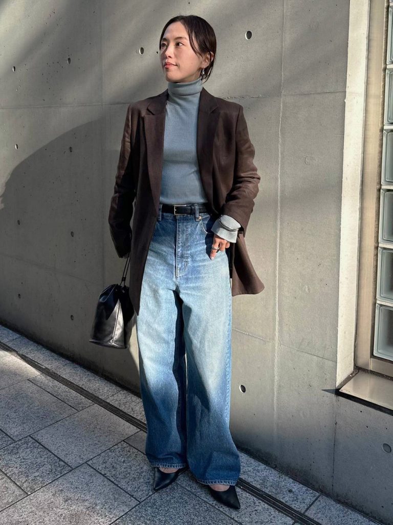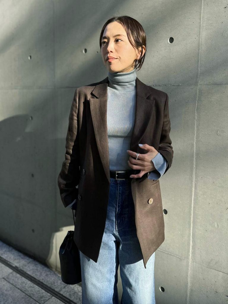 この春おすすめしたいのが、「ブルー×ブラウン」の配色。冒頭でもご紹介した、リネンヘリンボンストレートパンツの新色「ブラウン」と合わせれば、ブルーの冷たさとブラウンの温かみが混ざり合い、ぐっとモダンな印象に。 デニム合わせで爽やかに着るのはもちろん、こうしてシックな色と合わせることで、ライトブルーの新しい魅力が引き立ちます♪