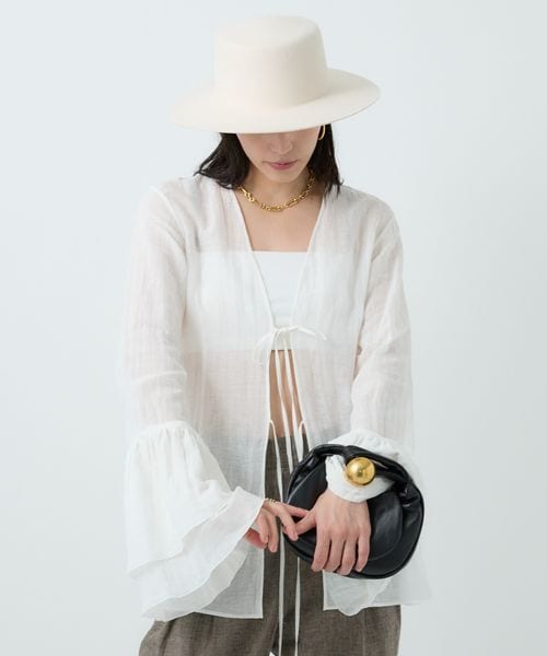 薄いガーゼ素材が心地良く、袖のボリュームのあるフリルと、フロントのリボンがポイント!