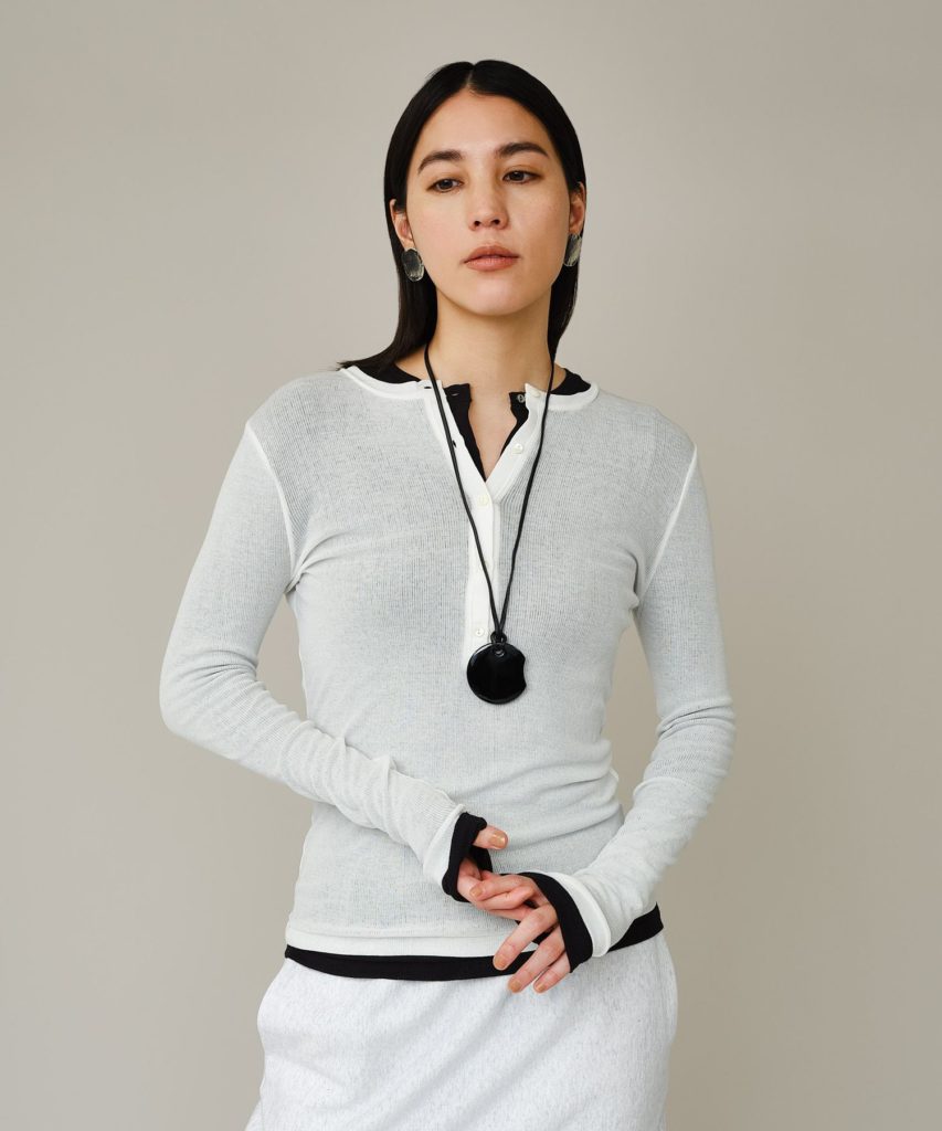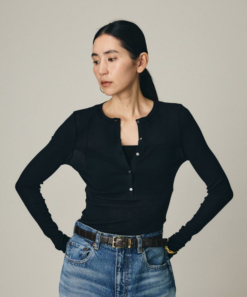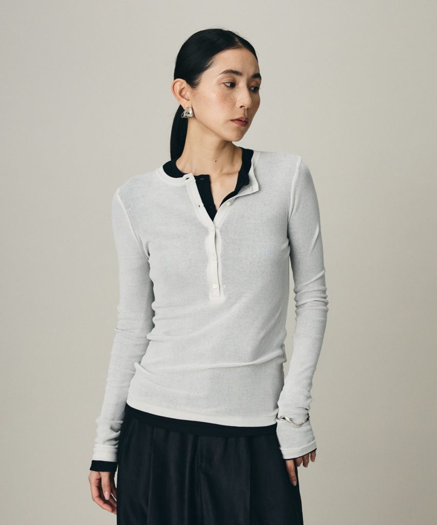 カジュアルなイメージの強いヘンリーネックを、華奢な前立てと繊細なサイズ感で、女性らしい表情に仕上げました。 強撚糸のテレコ素材は、ドライな清涼感がありながら、特殊加工による素肌に吸い付くような滑らかさも魅力。ボタンを少し開けてデコルテを覗かせれば、ヘルシーでセンシュアルな着こなしに。 「ただのカジュアル」では終わらない、大人のためのベースアイテムです。色違いをレイヤードして着こなすのも、今の気分にぴったり。