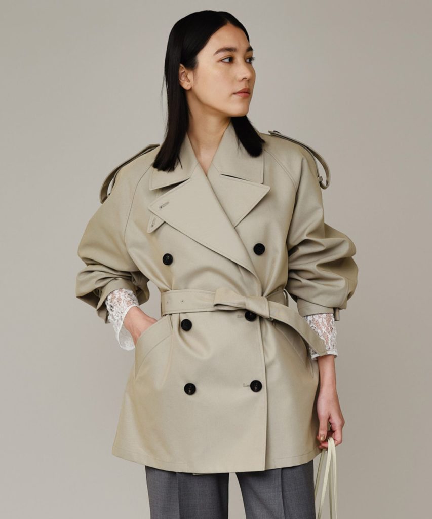 トレンチコート特有の重厚なディテールはそのままに、大胆な袖のボリュームとショート丈で新鮮なバランスに仕上げました。 バサッと羽織るだけで様になる、計算されたオーバーシルエットです。特徴的な肩章は取り外しが可能。 襟を立ててチンウォーマーを留めれば端正な表情に、ベルトでウエストマークすればメリハリのあるシルエットにと、その日の気分に合わせて印象を変えられます。素材は、撥水加工を施した高密度のコットンポリエステルシャンブレー。 裏面にコーティングを施すことで風を通しにくく、独特の張り感を実現しました。 着込むほどに体に馴染んでいく経年変化も楽しみの一つ。 ゆったりとしたサイズ感でインナーを選ばず、季節の変わり目に頼れる一着です。