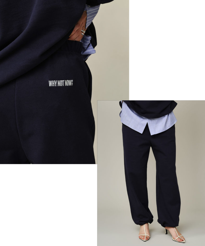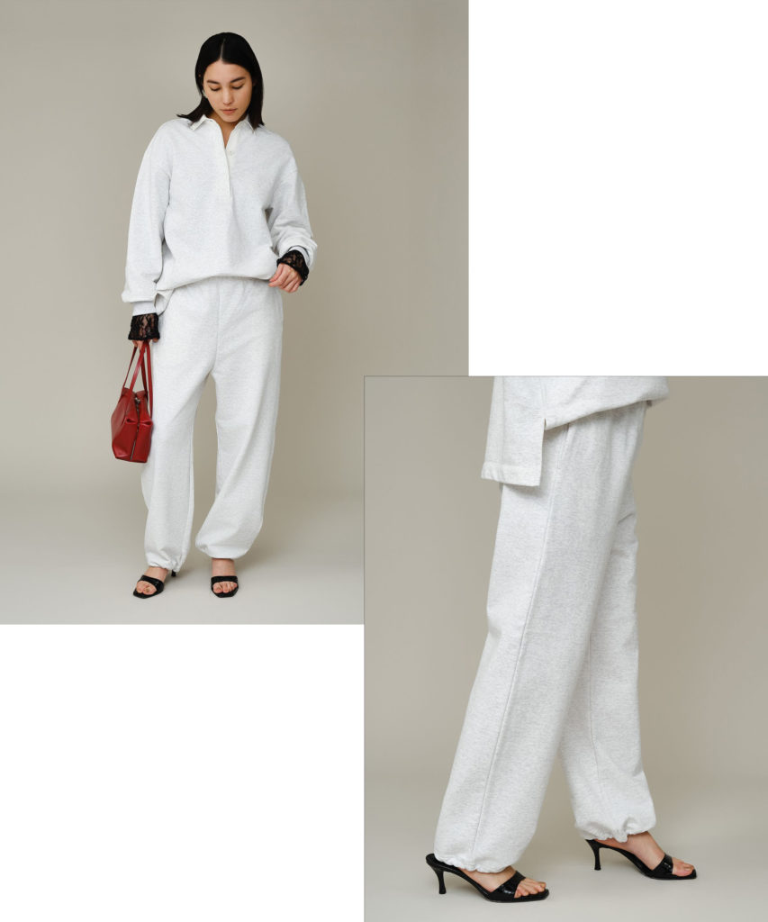 リラックス感はそのままに、ルーズに見せない計算された一本が【WHY NOT NOW】から登場しました。最大の特徴は、少し丸みを帯びた独特なシルエットと、たっぷりと長めに取った着丈。 そのままフルレングスで履けば、裾に自然な溜まりが生まれ、モードな雰囲気に。 裾にはドロストを配しているため、キュッと絞って足首を見せれば、華奢なヒールサンダルとも相性抜群です。大人が懸念する「膝抜け」や「型崩れ」を解消するため、高密度なハイゲージ裏毛を採用。 張り感のあるシャープな表面感で、美しいフォルムを長くキープします。後ろの刺繍がさりげないアクセントに。