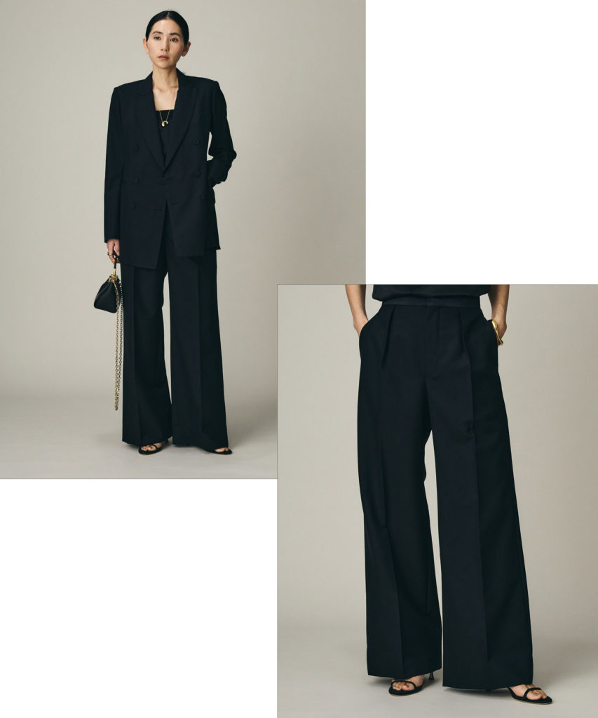 本格的なメンズ仕立てを採用したテーラードジャケットと、洗練された強さと美しさが共存するワイドパンツ。 イタリア・NALYA社のリネンレーヨン素材を使用し、麻のドライなシャリ感と、レーヨン特有の滑らかな落ち感を融合させました。ジャケットは、肩パッドや胸増しを施した構築的なつくりでありながら、ウエストの絞りを緩やかにすることでモードな抜け感を演出。 対するパンツは、太めのベルト幅でウエストを潔くマークし、腰位置を高く見せてくれます。 セットアップでハンサムに決めるのはもちろん、それぞれ単品でも主役になる存在感です。