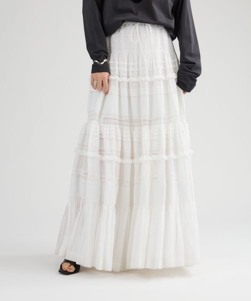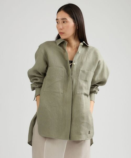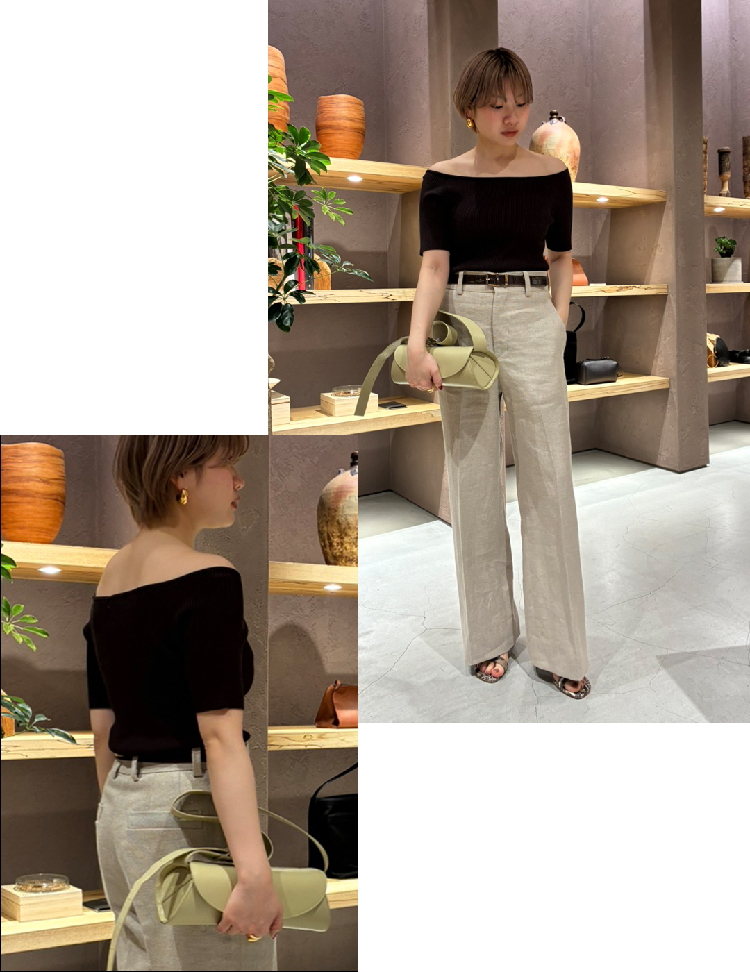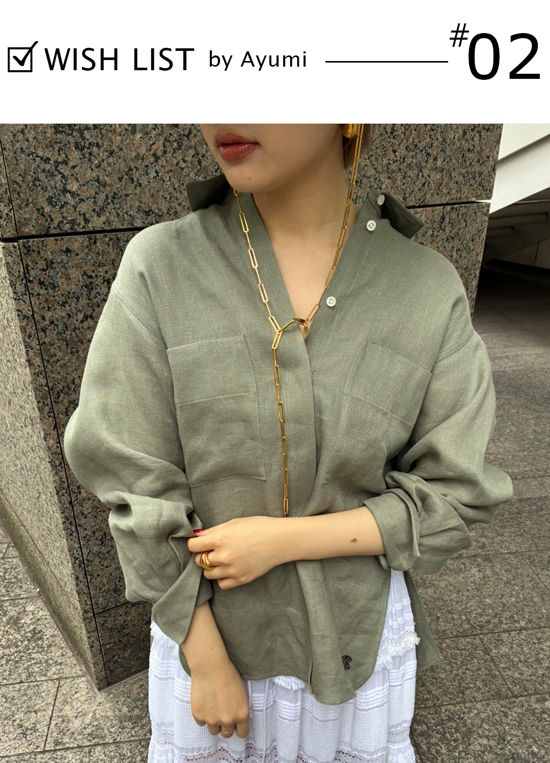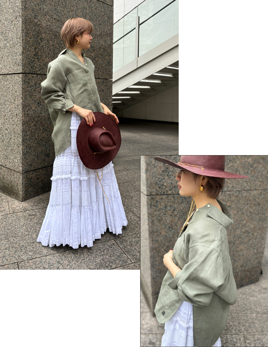 数ある名品の中でも、このリネンシャツはやはり毎シーズン手に入れたい特別な存在。 スタッフの所有率もかなり高く、「これさえあれば」と絶大な信頼を寄せているアイコニックな一着なんです。また、このセージカラーは今シーズンならではの特別なカラーリングなのも大きな魅力。今回合わせたようなボリュームのあるスカートにはもちろん、パンツやタイトスカートなど、どんなボトムスとも相性がいいので着回し力抜群でスタイリングに幅をもたせてくれます。