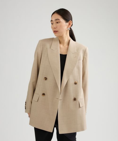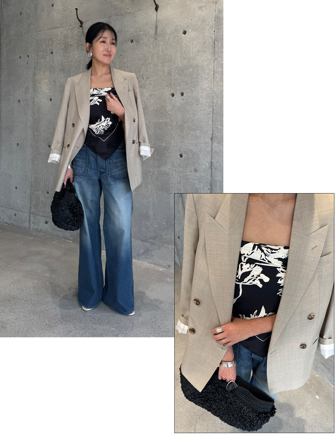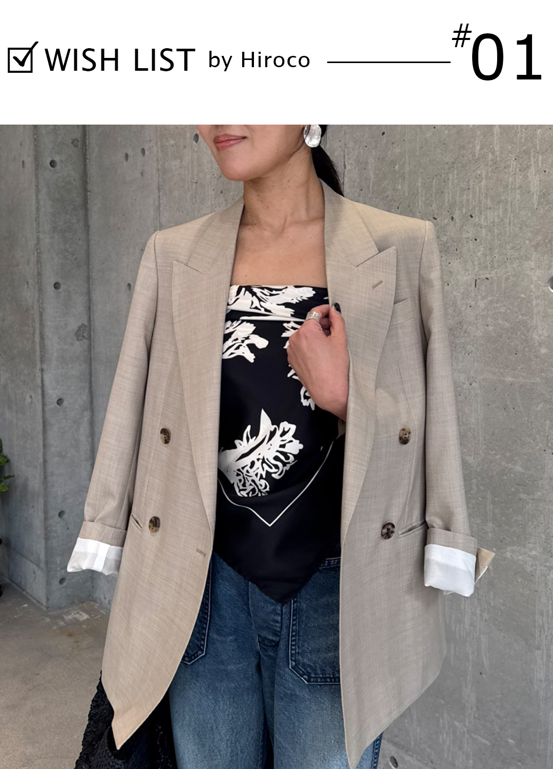 季節の変わり目に一番頼りになるのは、さらりとカーディガン感覚で羽織れるジャケット。カラーリングも惹かれるポイントで、グレーを含んだニュアンスベージュが装いをぐっとモダンな印象に引き上げてくれます。そして着用してみて何よりも感動したのは、「軽さ」です!希少な極細ウールを使用した梳毛素材は、肌に触れた時の滑らかさが驚くほどしなやか。ウールといってもライトな質感なので、季節の端境期を自然につないでくれる汎用性の高さも魅力です。