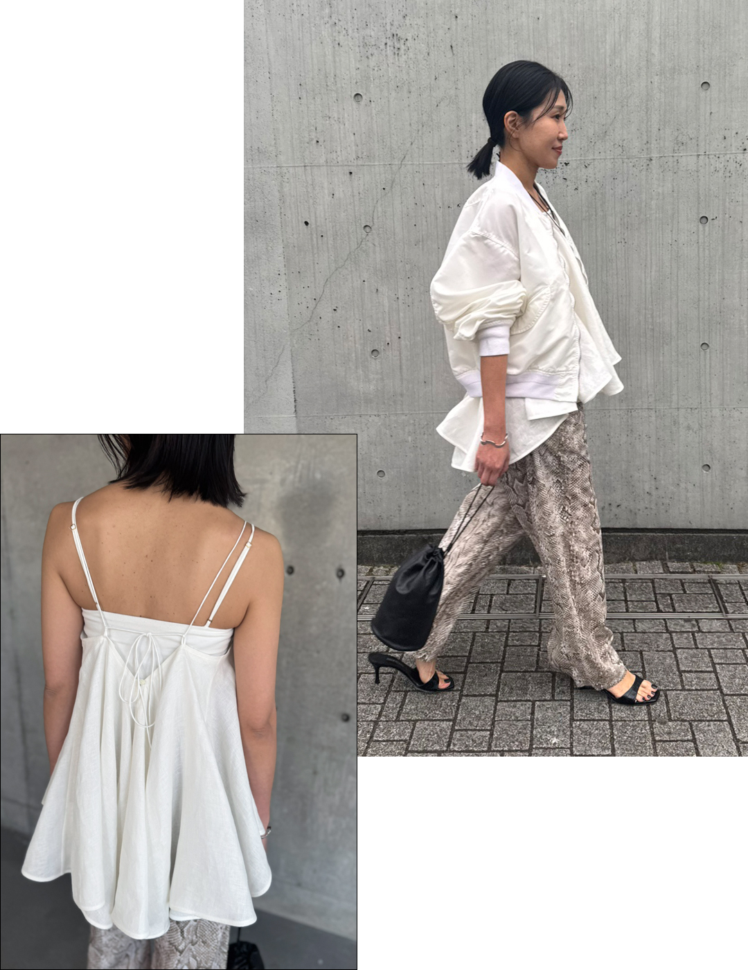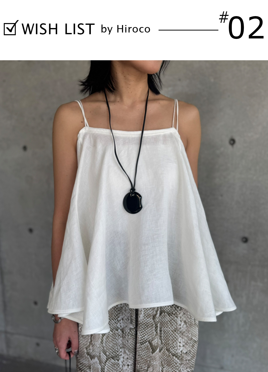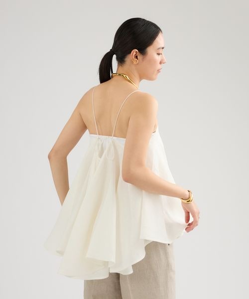 一枚で主役になるドラマティックなフレアシルエットが特徴のキャミソール。まだ肌寒い春の始まりには、MA-1やマスキュリンなジャケットのインナーに。 アウターの裾から軽やかなフリルを覗かせ、華やかさをプラスしながら春を取り入れるのが今の気分です。そして、季節が進み暑さが厳しくなる真夏には一枚で。バックスタイルに抜け感を持たせた、Chaosらしいデザインは潔くヘルシーに纏いたいです。肌離れのいいフレンチリネンは、天然素材ならではの清涼感がある生地感なので涼しく快適に過ごせる予感がしています!