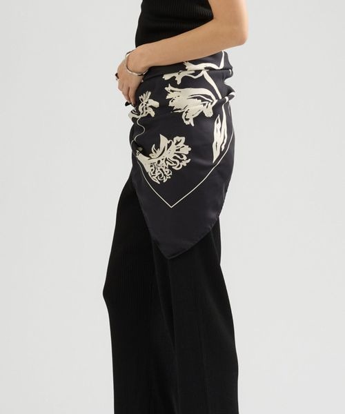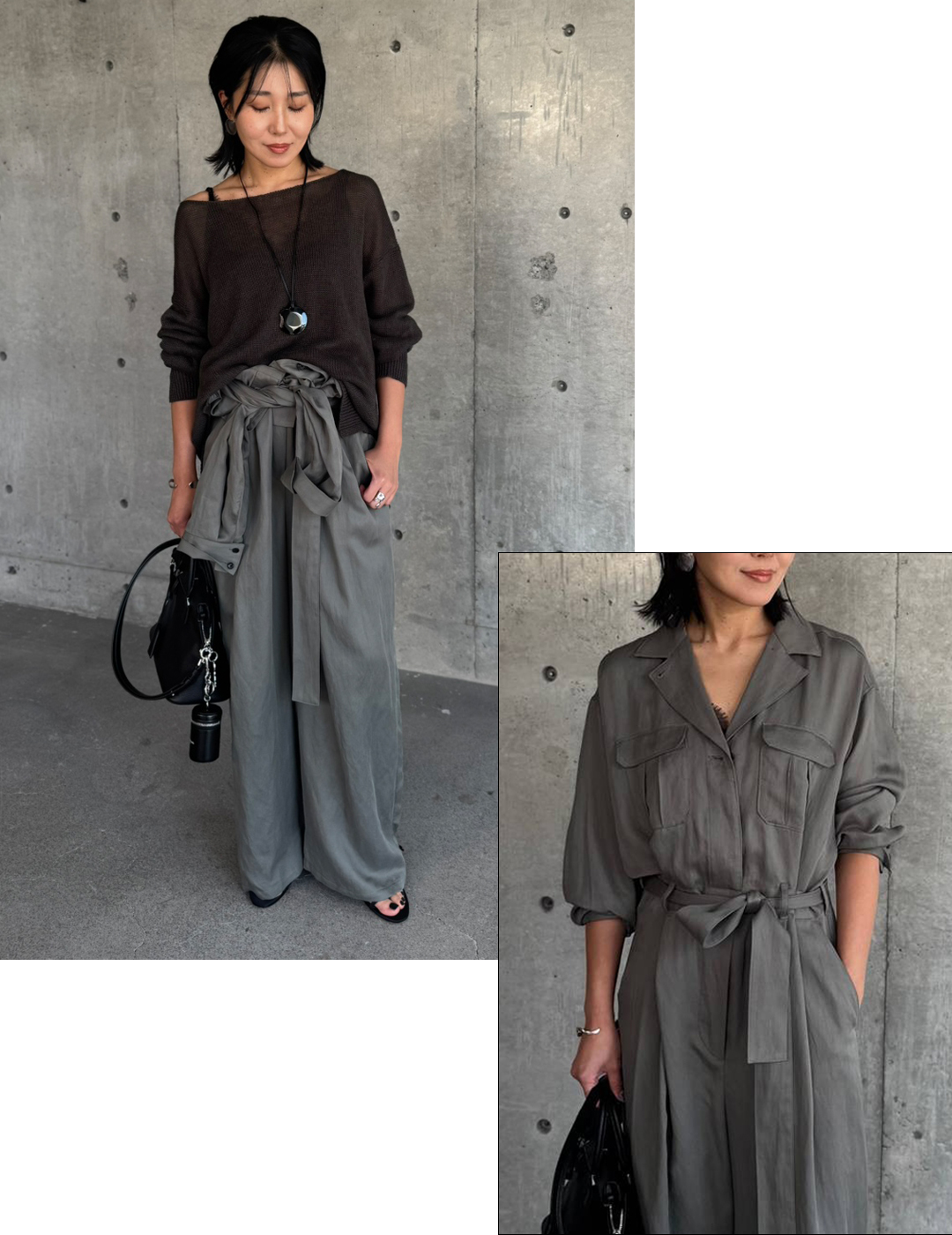 3月のChaosのテーマのひとつ、「Elegant military」。 そのムードを美しく、そしてモダンに表現しているのがこのオールインワンです。ミリタリーなアイテムは、どうしてもメンズライクに寄り過ぎてしまうことがありますが、こちらは別格。 しっとりと艶のあるサテン素材の落ち感と、計算された胸元のV開きのバランスが絶妙で、袖を通すと女性らしい佇まいに仕上がります。ウエストのリボンをキュッと絞ってシルエットにメリハリをつけたり、裾のタブで足元をアレンジしたり、腰巻きにしてみたり・・・。その日の気分で様々な着こなしが楽しめるのも嬉しいポイントです。
