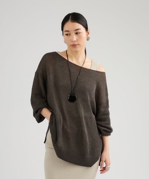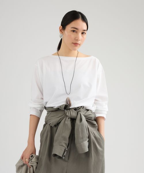 抜け感のあるボートネックが、顔周りをすっきりと見せるデザイン。