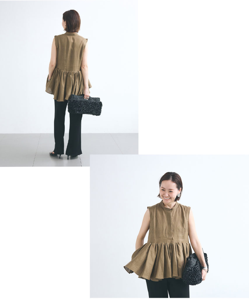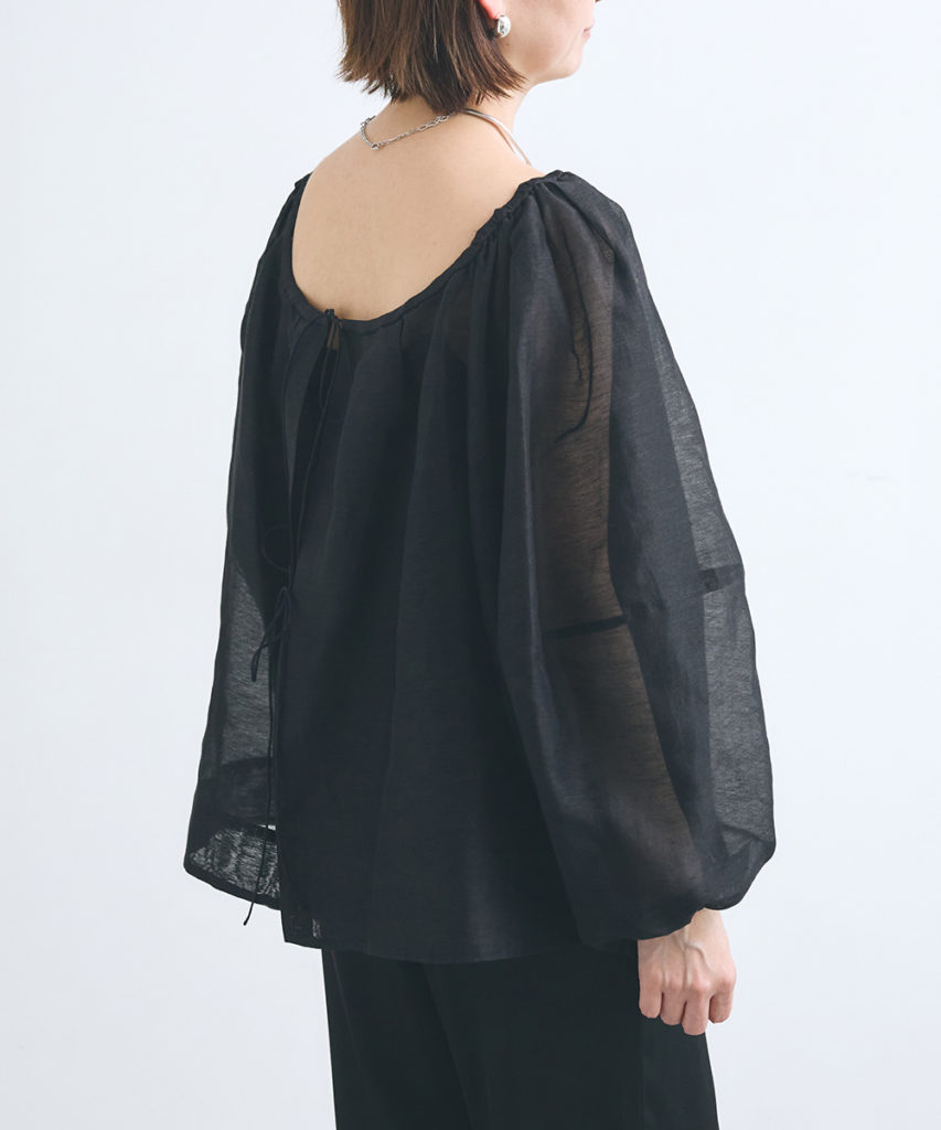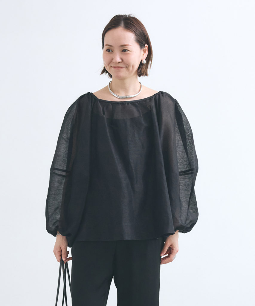 シルクリネン素材のブラウスは、驚くほど軽やかで、肌への張り付きもなく夏まで涼しく着用できるのが嬉しいポイントです。