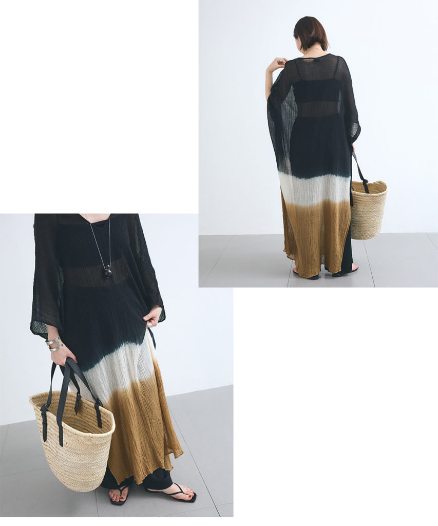 ラストはAMBAS別注のドレスを主役に、週末のお出かけをイメージしたスタイリング。