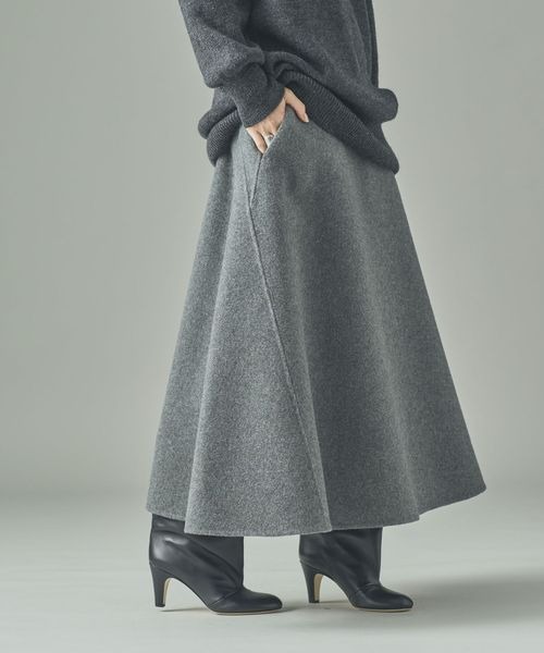 ウールボンディング素材のしっかりとした張り感を活かした上品なフレアシルエットスカートをメインに、肩にかけたスウェットが気温調整しやすくおしゃれに決まるスタイリングにしてみました。スカートは斜めに走るサイドの切り替えが立体感を強調し、足首が見える絶妙な着丈がスタイリングに抜け感をプラスしてくれます。今シーズン注目のロングブーツ合わせで、今年らしいバランスで着こなしたのがポイントです。