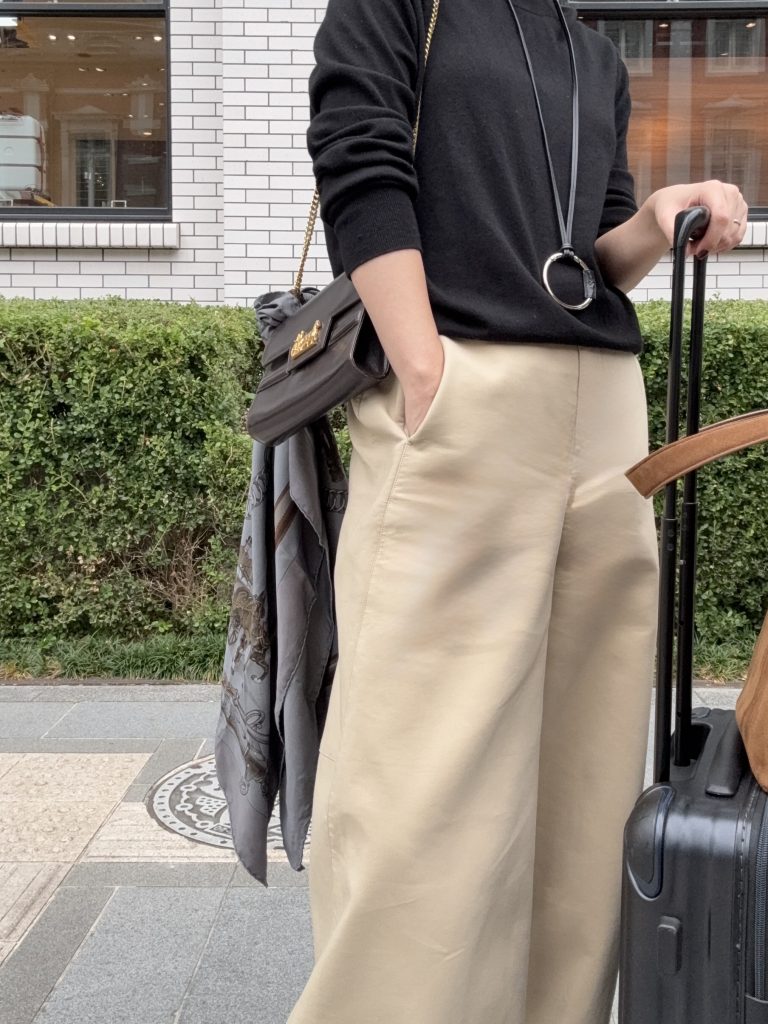 バッグには、お気に入りのエルメスのヴィンテージスカーフを結んでポイントに。