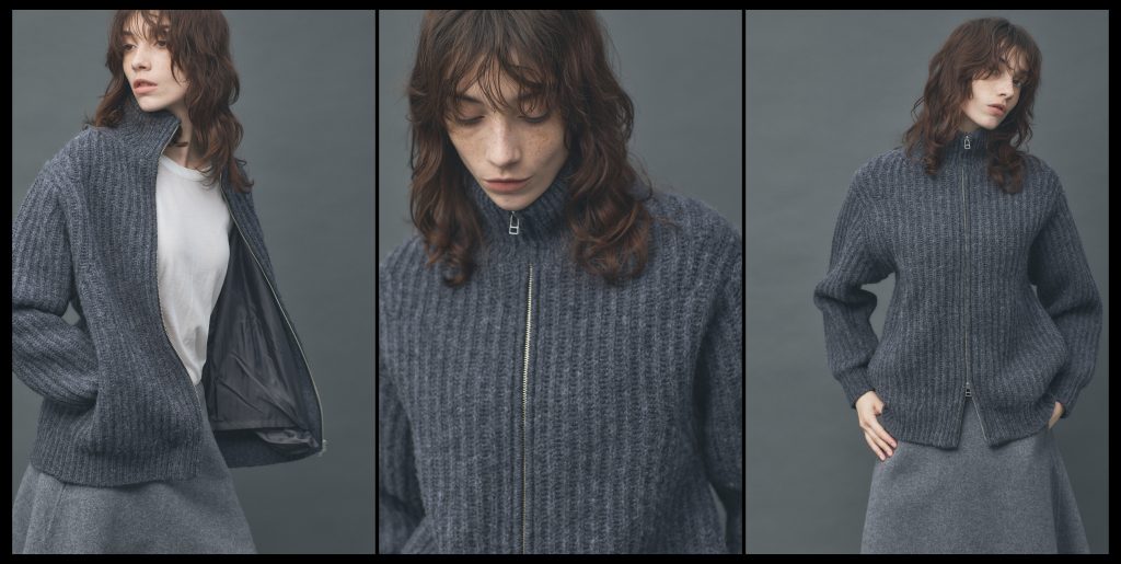 そんなスタッフの声から実現した「アゼアミニットブルゾン」は、細部のディテールやデザイン、糸の種類や編地までこだわったカレンソロジーらしい一枚。