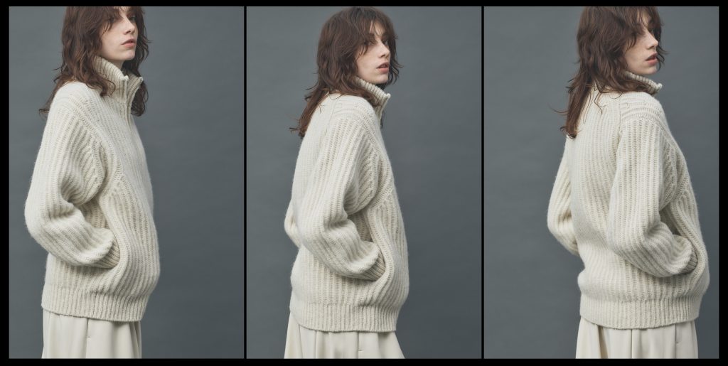 ポケットはスラッシュポケットでミニマルなデザインにすることでプルオーバーやカーディガンとして着用したときのバランスにもこだわっています。