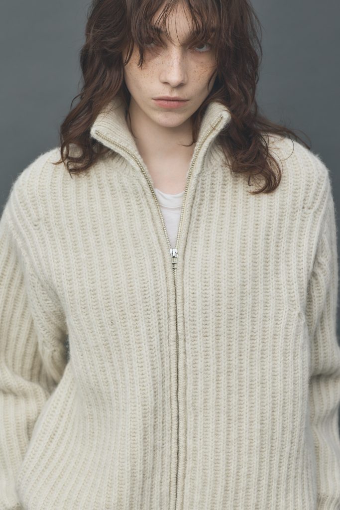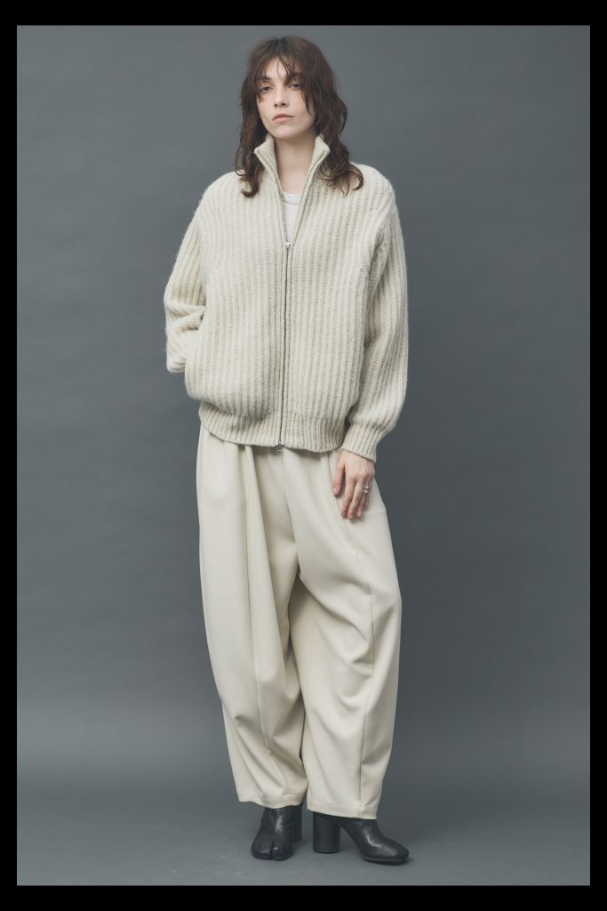 ドライでハッシュなウールの紡毛糸を使い、畦編みにして肉厚で柔らかい風合いを生み出しながらもカジュアルすぎないマニッシュで大人の雰囲気に仕上げました。