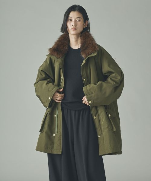 アウターは、熱を閉じ込める効果が高い「ボアアウター」や「中綿のコート」が最適。見た目にも暖かく、トレンド感も演出。