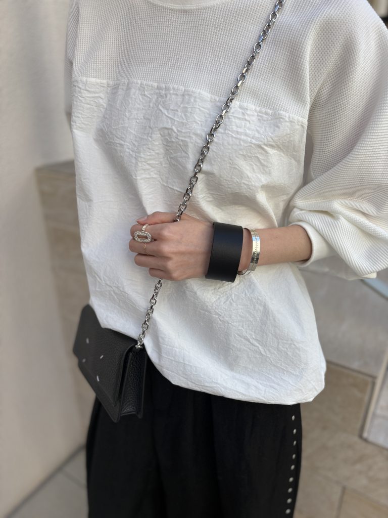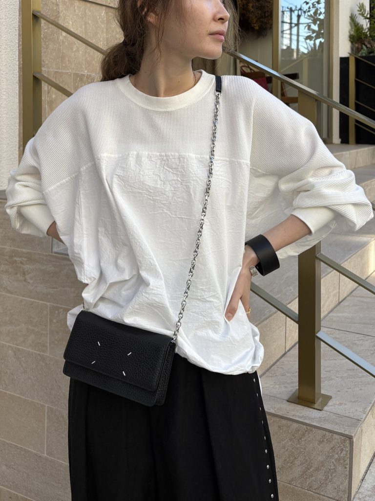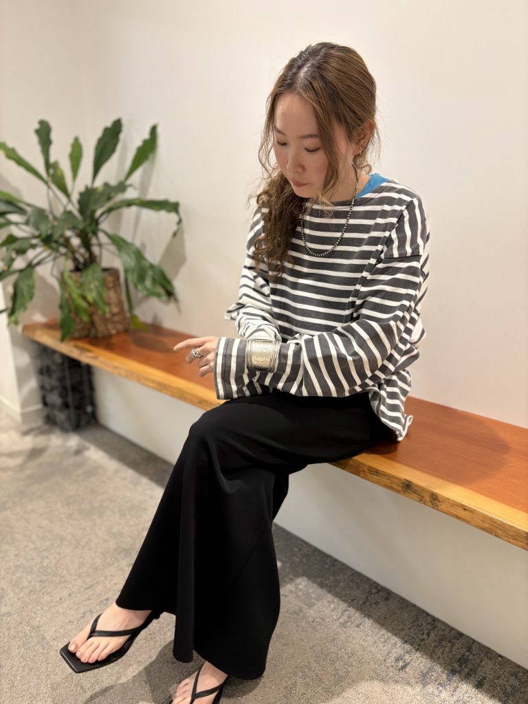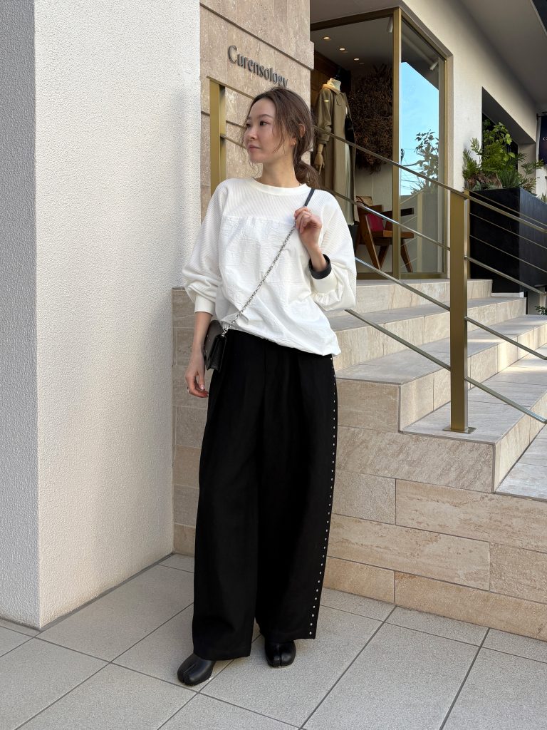 今回は、サイドに贅沢にあしらわれたメタルスタッズが目を惹く新作の“リネンウールスタッズパンツ”を合わせて、リラクシーな中にエッジを効かせたスタイルに。 こちらは予約でも大人気の注目のパンツです♪ワッフル素材のラフな抜け感と、スタッズのクールな輝きが加わることで、ラフになりすぎず都会的でシャープな佇まいへと昇華させてくれます。 パンツはウール混で温かみがありつつも、トップスのドライな質感と相まって、季節の変わり目にぴったりな軽やかさをキープ。 どちらも今から春本番まで、ロングシーズン頼れる優秀アイテムです♡